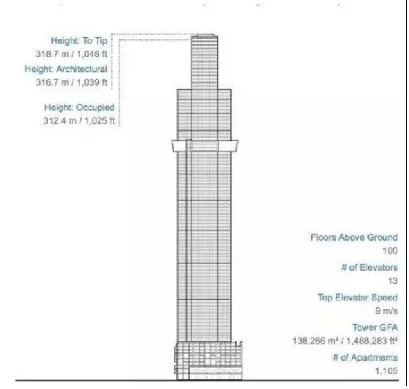 从下图的Australia 108图纸,大家可看到,这栋楼有100多层,高318米。向这样高的大楼内泵送混凝土,需要一直加压。