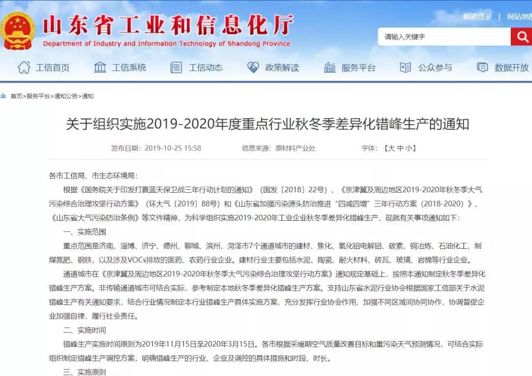 根据《国务院关于印发打赢蓝天保卫战三年行动计划的通知》(国发〔2018〕22号)、《京津冀及周边地区2019-2020年秋冬季大气污染综合治理攻坚行动方案》(环大气〔2019〕88号)和《山东省加强污染源头防治推进“四减四增”三年行动方案(2018-2020)》、《山东省大气污染防治条例》等文件精神,为科学组织实施2019-2020年工业企业秋冬季差异化错峰生产,现就有关事项通知如下: