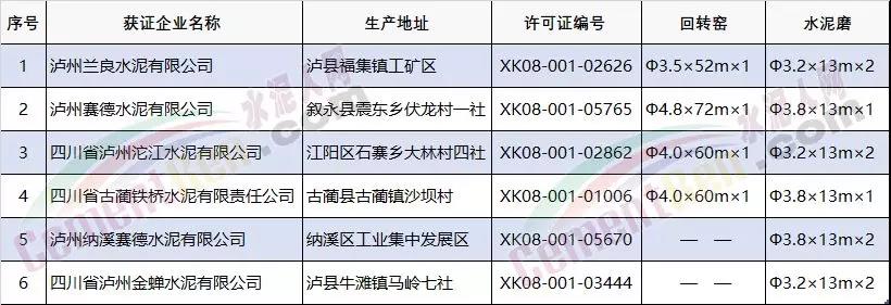据查询,市场监管总局工业品生产许可证办公室数据显示四川省泸州市6家已取得工业品生产许可证的水泥企业中泸州兰良水泥有限公司、泸州赛德水泥有限公司、四川省泸州沱江水泥有限公司、四川省古蔺铁桥水泥有限责任公司4家企业关键设备中包括熟料生产工序关键设备回转窑及水泥生产工序关键设备水泥磨;而泸州纳溪赛德水泥有限公司和四川省泸州金蝉水泥有限公司关键设备仅包括水泥磨。
