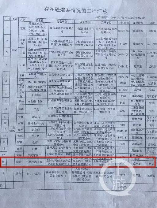 记者获取的一份由当地施工主管部门出具的《存在砼爆裂情况的工程汇总》表显示,同期使用宜兴市三木建材有限公司混凝土导致项目出现质量问题的工程共有19处,建筑面积达473224平方米。其中爆裂情况较严重的项目共有4个,西郊农副产品交易市场就是其中之一。