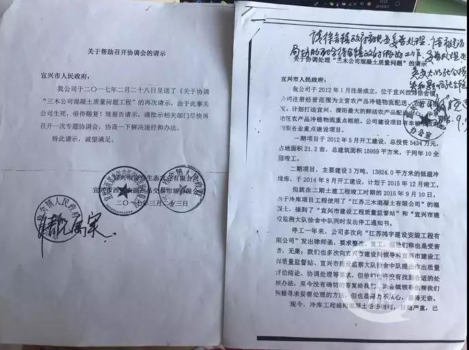 4年里,周顺奇一次又一次向宜兴市委市政府、宜兴市住建局反映,寻找鉴定和处理结果,但收效甚微,期间随着爆点的增多,原本的冷库也已经成为危楼。 据周顺奇提供的自2016年至2017年多份政府批文显示,宜兴市人民政府曾多次要求宜兴市住建局配合徐舍镇妥善处理好西郊农副产品交易市场因混凝土质量问题停工问题。但周顺奇称:“住建部门多次要求我们做鉴定,交了大笔的鉴定费后,只是说混凝土存在不稳定因素,但并没有说明该建筑是否应当被拆除或可以改为他用,也没有说明混凝土企业是否应承担相应责任。”由江苏省东南建设工程安全鉴定有限公司出具的两份鉴定报告也证实了周顺奇的说法。事故发生后,宜兴市住建局始终未追究宜兴市三木建材有限公司“生产销售假冒伪劣产品”的责任。2017年8月,周顺奇将宜兴市人民政府、宜兴市住建局告上法庭。请求无锡市中级人民法院依法认定宜兴市人民政府、宜兴市住建局对造成建设工程特大质量事故的处置严重失控,属行政不作为;同时判令两部门及时按照国务院关于《生产安全事故报告和调查处理条例》严格执行。“混凝土生产企业需要由经信委的立项,住建局的审批和环保局的环评报告,而且还要办理销售许可证,而我了解到宜兴市三木建材有限公司的证件并不齐全。”周顺奇说。据2018年1月16日无锡市中级人民法院庭审笔录显示,庭审中,对于周顺奇的诉求请求,宜兴市人民政府、宜兴市住建局称其均严格按照相关法律规章的规定,依法履行了各项职责,并不存在违法情形。同时,宜兴市住建局表示,目前事故原因和事故经过已很清楚,但造成的损失无法确认。后经法院协调,2019年1月18日,宜兴市人民政府向无锡市中级人民法院送达了协调函。关于周顺奇一案,目前宜兴市人民政府正在积极协调处理此事,要求暂停审限。