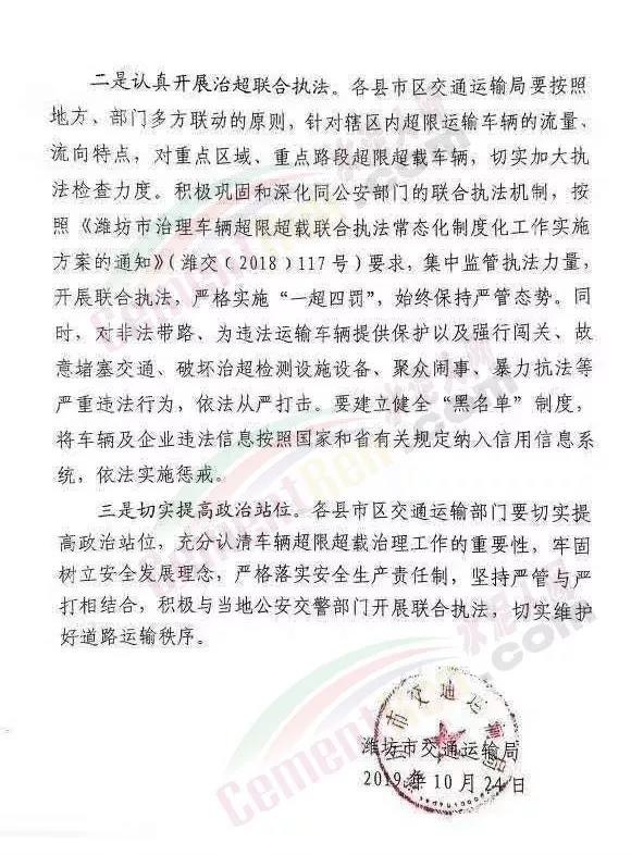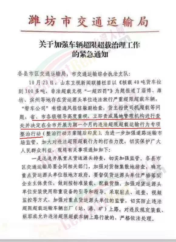 为进一步加强道路运输市场监管,加大对违法超限超载行为的打击力度,切实保护广大人民群众利益,并将相关事项通知如下:一、迅速开展重点货运源头排查,切实加强监管各县市区交通运输局要会同相关部门,加强对货物集散地排查,确定重点货运源头单位报地方政府,要督促货运源头单位严格落实企业主体责任,做到按标准装载、配载货物。加强对货运源头单位安装使用称重设备和引导和指导。采取驻点、巡查、视频、监控等方式,加强对重点货运源头单位的监管,切实防止违法超限超载运输车辆出厂(站、港、矿)上路。对违反规定装载、纵容或允许违法超限超载车辆上路行驶的,严格依法处理。二、认真开展治超联合执法各县市区交通运输局要按照地方、部门多方联动的原则,针对辖区内超限运输车辆的流量,流向特别,对重点区域 、重点路段超限超载车辆,切实加大执法检查力度。积极巩固和深化同公安部门的联合执法机制,按照《潍坊市治理车辆超限超载联合执法常态化制度化工作实施方案的通知》(潍交【2018】117号)要求,集中监管执法力量,开展联合执法,严格实施“一超四罚”,始终保持严管态势。同时,对非法带路,为违法运输车辆提供保护以及强行闯关、故意堵塞交通、破坏治超检测设施设备、聚众门事、暴力抗法等严重违法行为,依法从严打击。要建立健全“黑名单”制度,将车辆及企业违法信息按照国家和省有关规定纳入信用信息系统,依法实施惩戒。三、切实提高政治站位各县市区交通运输部门要切实提高政治站位,充分认清车国内超限超载治理工作的重要性,牢固树立安全发展理念,严格落实安全生产责任制,坚持严管与严打相结合 ,积极与当地公安交警部门开展联合执法,切实维护好道路运输秩序。通知原文如下: