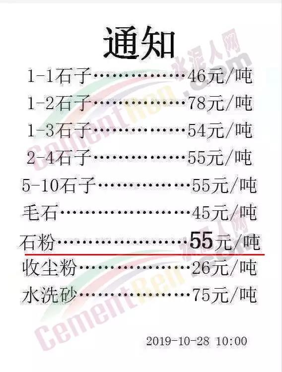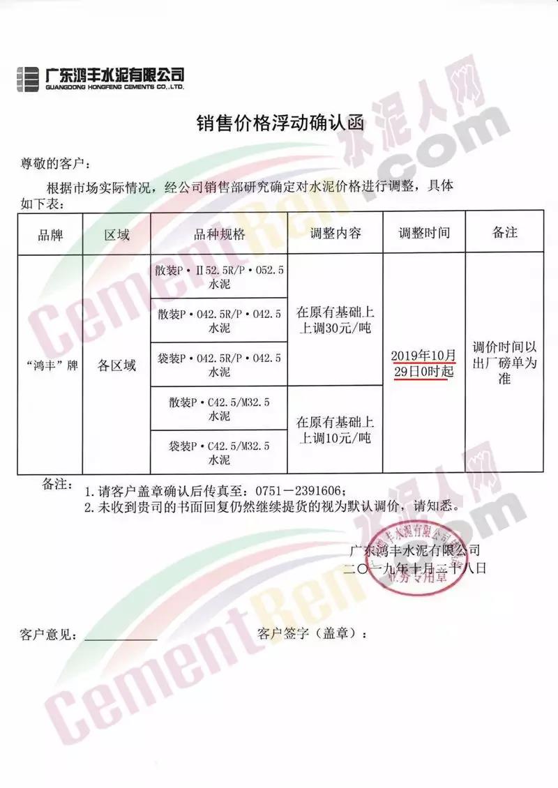 您好!根据原材料价格上涨,结合本公司实际情况。经研究决定,自2019年10月23日8:00起,本公司水泥在原价格基础上上调30元/吨。