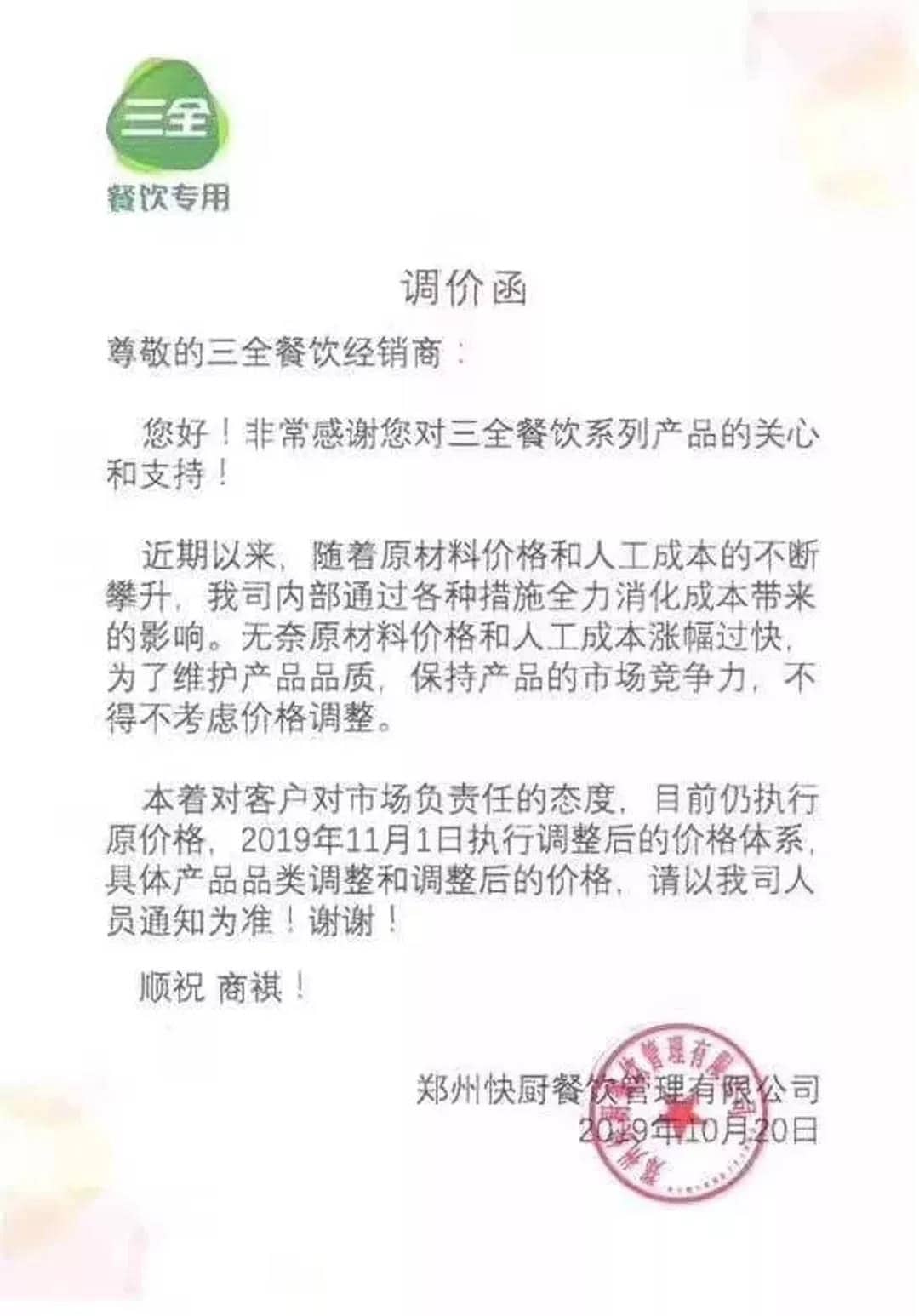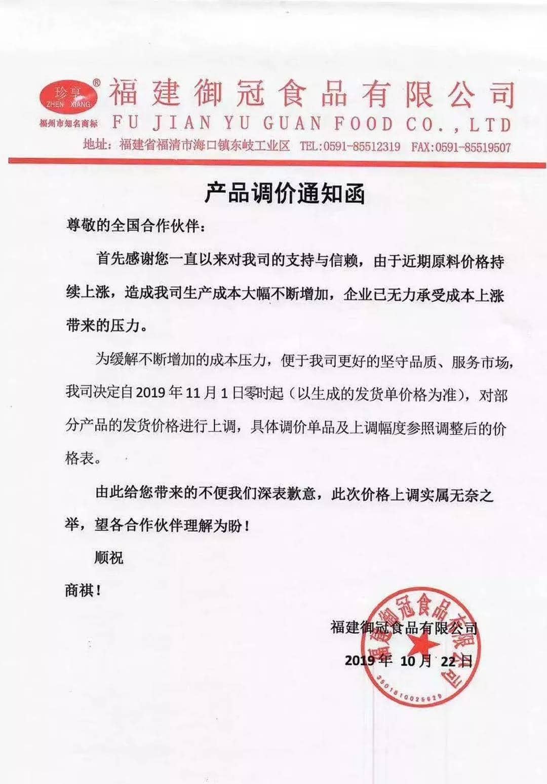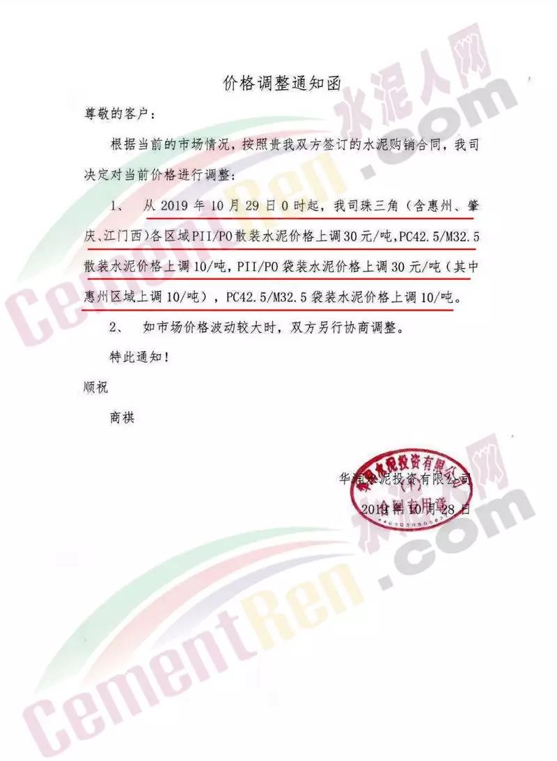 感谢您对南珠水泥厂的支持与信任。根据市场行情,自2019年10月23日起,我厂水泥价格上调20元每吨,继续订购视为同意并接受此次调价。特此函告,顺祝商祺!