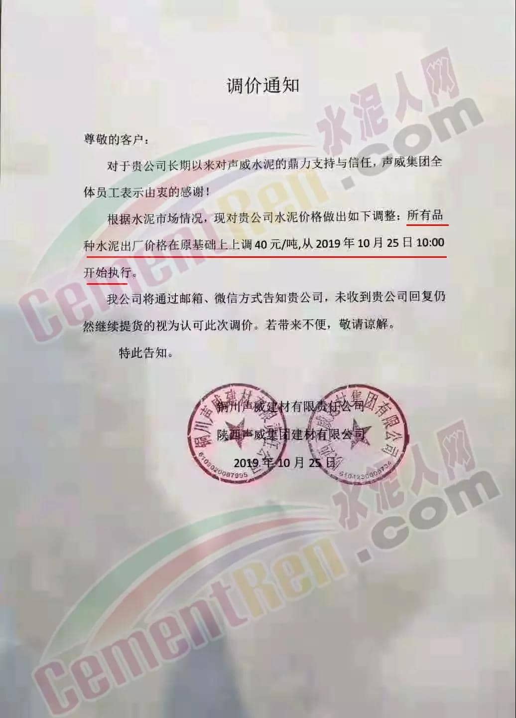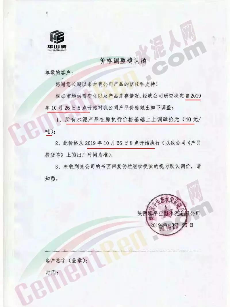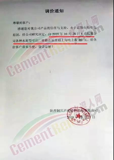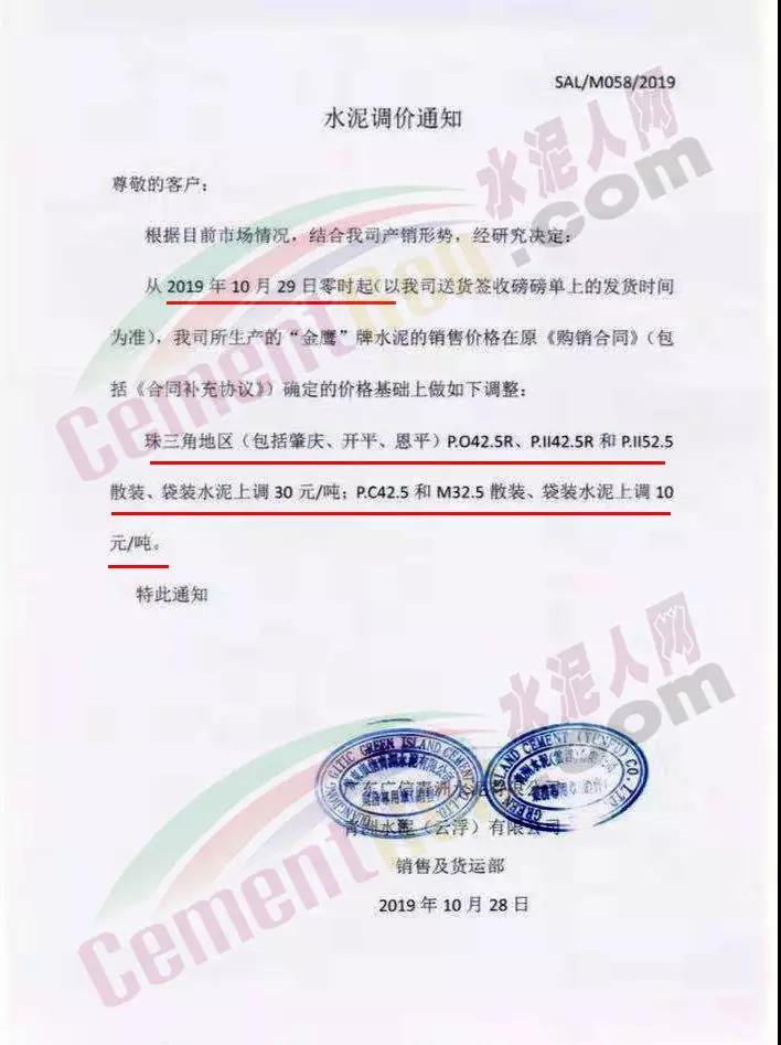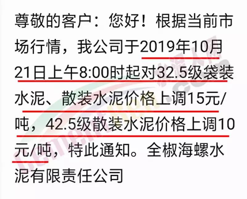 您好!感谢您对我司长期的信赖和支持,根据近期市场形势,我司决定于2019年10月22日00:00起,对所有品种的袋装和散装水泥出厂价格统一上调20元/吨。