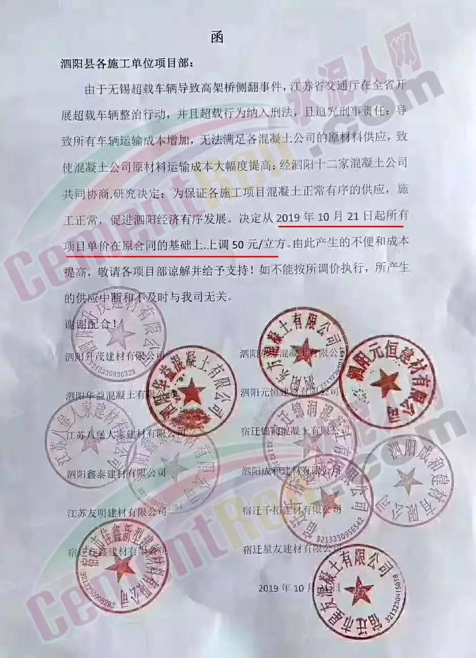 12家混凝土企业集体涨价水泥涨价,叠加多区域查超限,直接带给混凝土搅拌站及商砼企业成本上涨,21日江苏省泗阳县12家企业发布调价通知。通知函称由于无锡超载车辆导致高架桥侧翻事件,江苏省交通厅在全省开展超载车辆整治行动,并且超载行为纳入刑法,且追究刑事责任。导致所有车辆运输成本增加,无法满足各混凝土公司的原材料供应,致使混凝土公司原材料运输成本大幅度提高。经泗阳十二家混凝土公司共同协商研究决定,从2019年10月21日起,所有项目单价在原合同的基础上,上调50元/立方米。