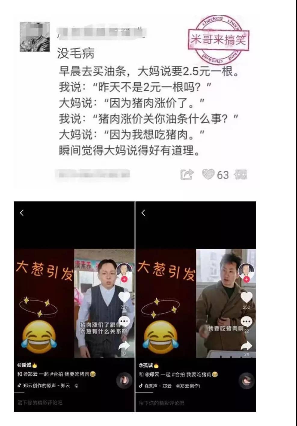 继猪肉涨价后,油条也涨价了,为何?因为卖油条的大妈说她想吃猪肉。猪肉涨价了,离鸡肉、鸭肉、牛羊肉涨价还远吗?