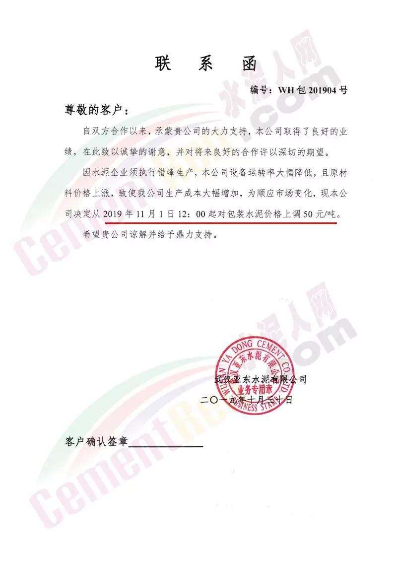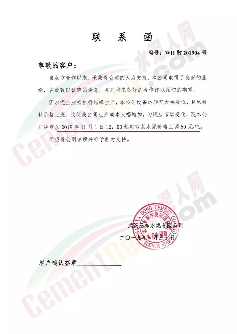 日前,湖北区域主导企业华新水泥、亚东水泥等发布调价通知称上调水泥价格,最高涨60元/吨。其中亚东水泥调价通知称,因水泥企业执行错峰生产,公司设备运转率大幅降低,且原材料价格上涨,致使公司生产成本大幅增加,为顺应市场变化 ,决定 自11月1日12时起对散装水泥上调60元/吨,包装水泥上调50元/吨。调价通知如下: