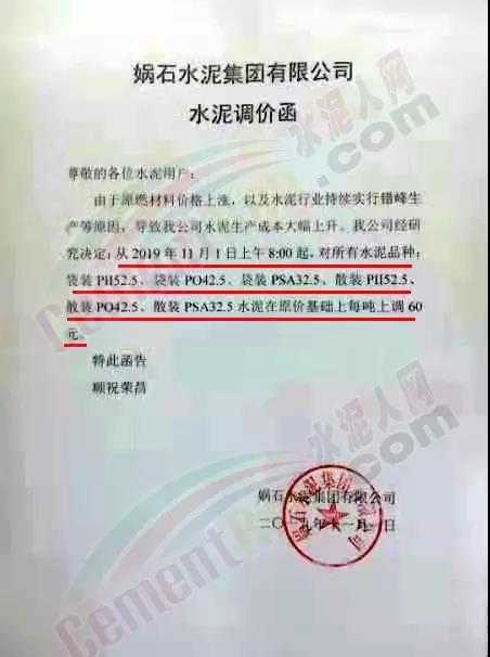 娲石水泥自11月1日上午8时起,水泥价格上调60元/吨