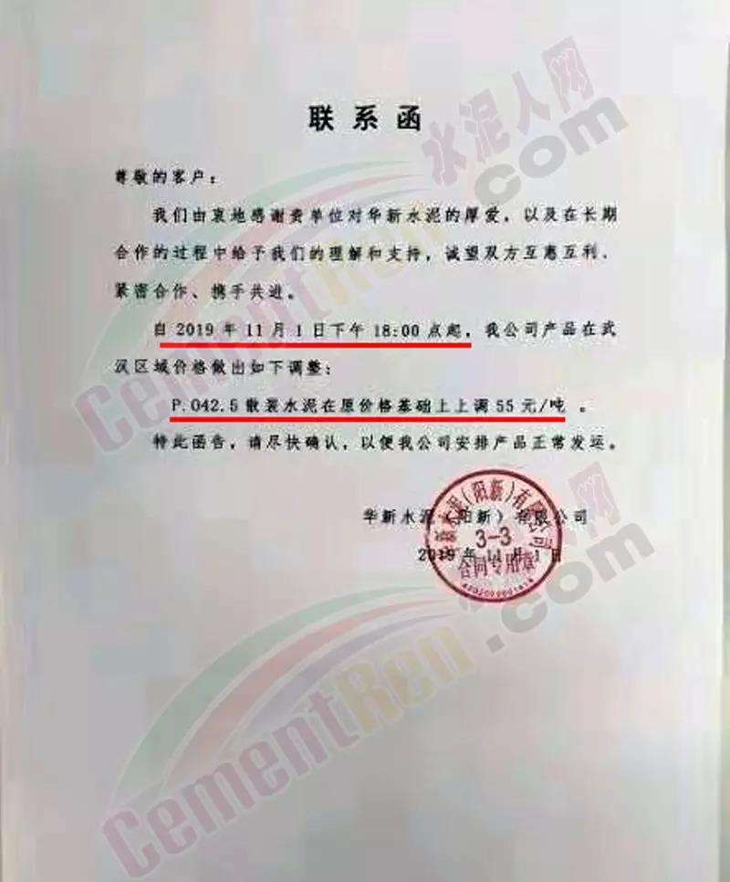 华新水泥(阳新)有限公司自11月1日下午18点水泥价格上调55元/吨。