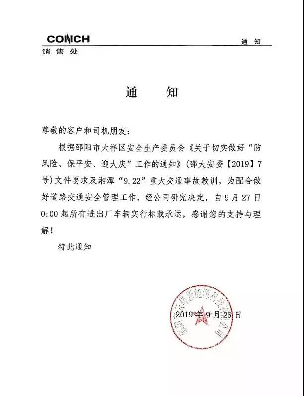 为积极响应政府指示精神,镇江北固海螺要求广大客户及货运承运方,能够自觉遵守国家相关法律法规及管理规定,做到合法合规运输。同时公司将依据政府相关规定,加强对进厂提货车辆的管理,推行标吨装载运输,按照《车辆行驶证》的核载量装货、严禁超重。