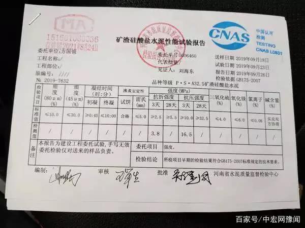 根据河南省水泥质量监督检验中心出具的实验报告,送检水泥样本强度符合标准规定的技术要求。