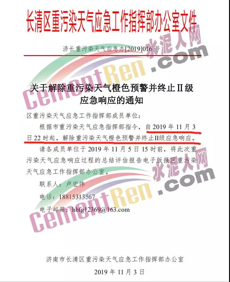 据水泥人网了解,昨日(11月3日)济南市生态环境局发布《关于解除重污染天气橙色预警并终止II级应急响应的通知》称,按照《济南市重污染天气应急工作指挥部办公室关于解除重污染天气橙色预警并终止II级应急响应的通知》(济重污染天气应急(2019)39号),济南市2019年11月3日22时起,解除重污染天气橙色预警并终止II级应急响应。