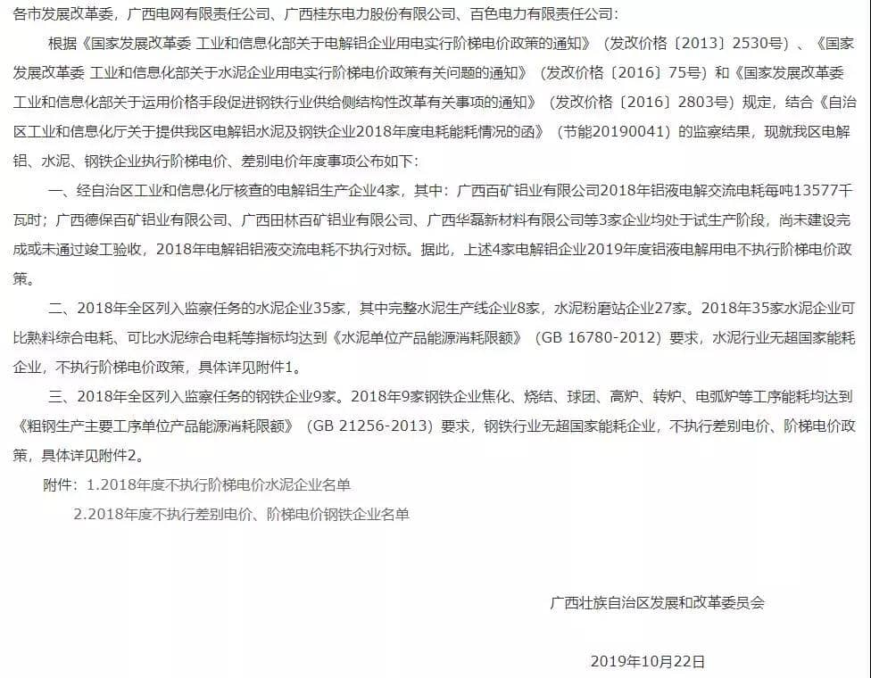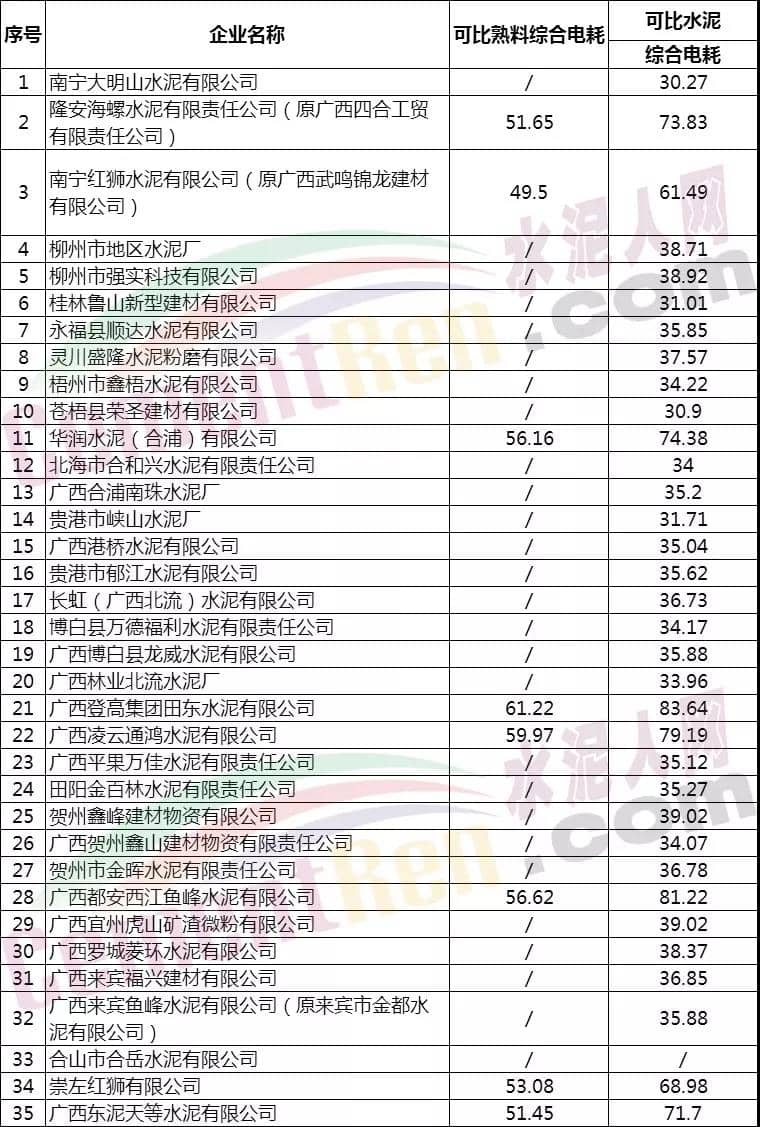 水泥人网消息:日前,广西壮族自治区发改委发布《广西壮族自治区发展和改革委员会关于我区电解铝水泥钢铁企业执行阶梯电价差别电价有关事项的通知》称: 2018年全区列入监察任务的水泥企业35家,其中完整水泥生产线企业8家,水泥粉磨站企业27家。2018年35家水泥企业可比熟料综合电耗、可比水泥综合电耗等指标均达到《水泥单位产品能源消耗限额》(GB 16780-2012)要求,水泥行业无超国家能耗企业,不执行阶梯电价政策。 通知原文如下: