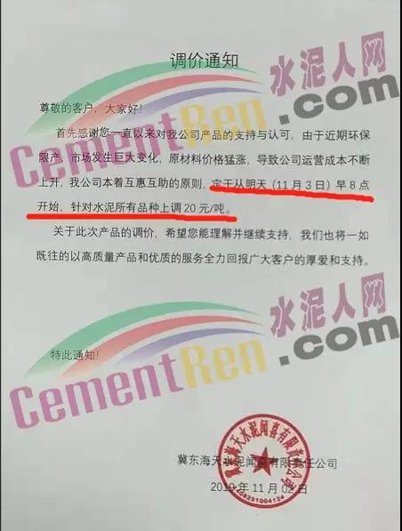 11月4日,安徽铜陵地区水泥行情上涨20元/吨,现主流品牌P.O42.5散装水泥价格在490-500元/吨。销量小幅提升,主要因库存偏低,水泥行情偏强运行。 11月4日,湖北荆州、荆门地区水泥价格上调20-30元/吨,下游区域水泥价格大幅上调,本地水泥价格随之上调,目前正逐步落实中,落实情况还有待跟踪。 11月2日,冀东海天水泥闻喜有限公司发布调价通知称:由于近期环保限产,市场发生巨大变化,原材料价格猛涨,导致公司运营成本不断上升,公司本着互惠互助原则,从11月3日早8点开始,所有品种水泥上调20元/吨。