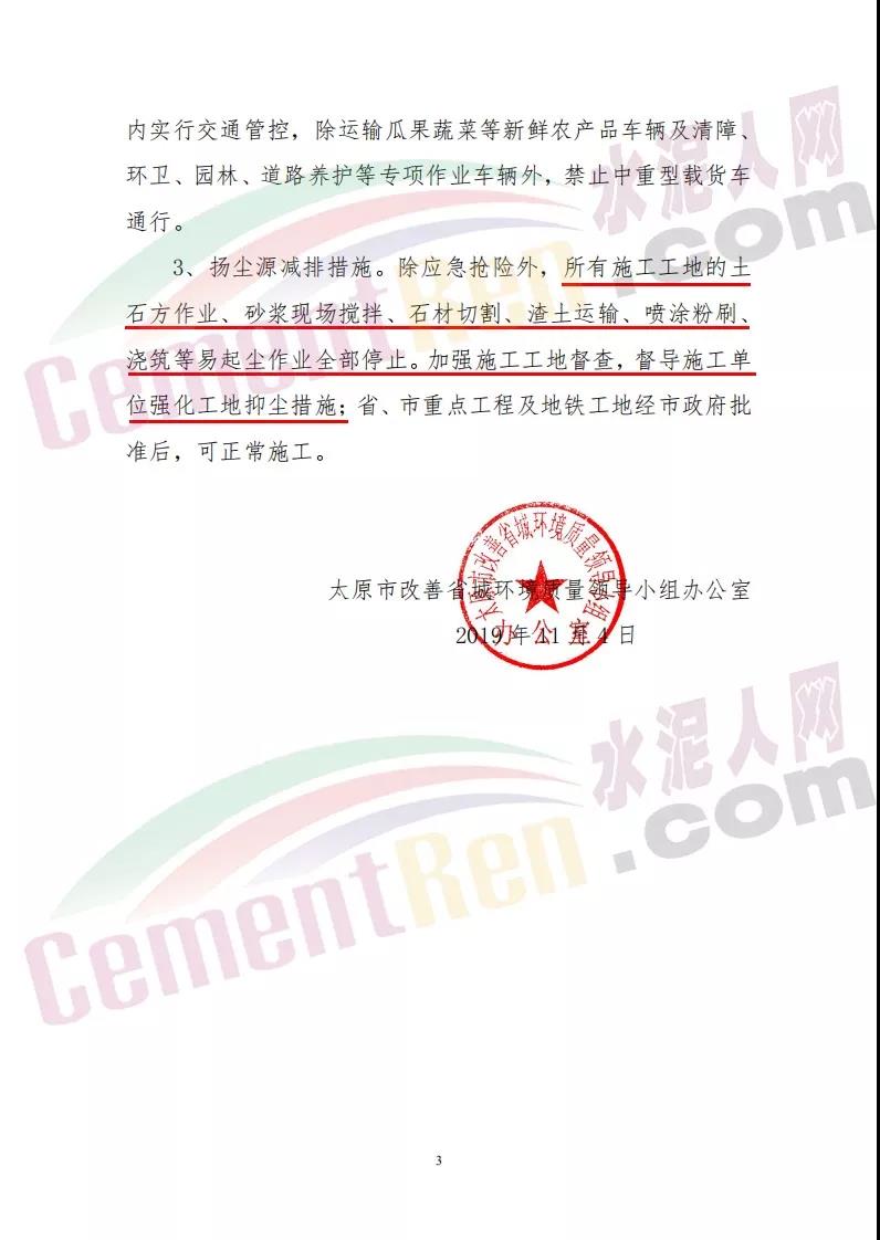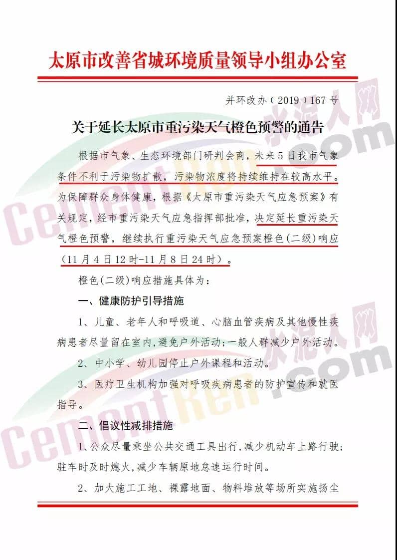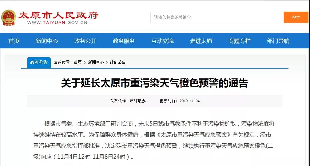 水泥人网消息:日前,太原市人民政府发布了《关于延长太原市重污染天气橙色预警的通告》称:根据太原市气象、生态环境环境部门研判会商,未来5日太原市气象条件不利于污染物扩散,污染物浓度将持续维持在较高水平,为保障群众身体健康,根据《太原市重污染天气应急预案》有关规定,经太原市重污染天气应急指挥部批准,决定延长重污染天气预警,继续执行重污染天气应急预案橙色二级响应(11月4日12时-11月8日24时)。通告原文如下: