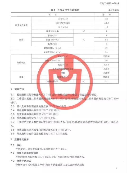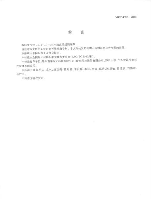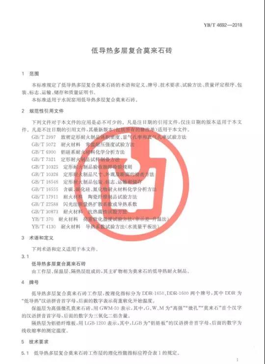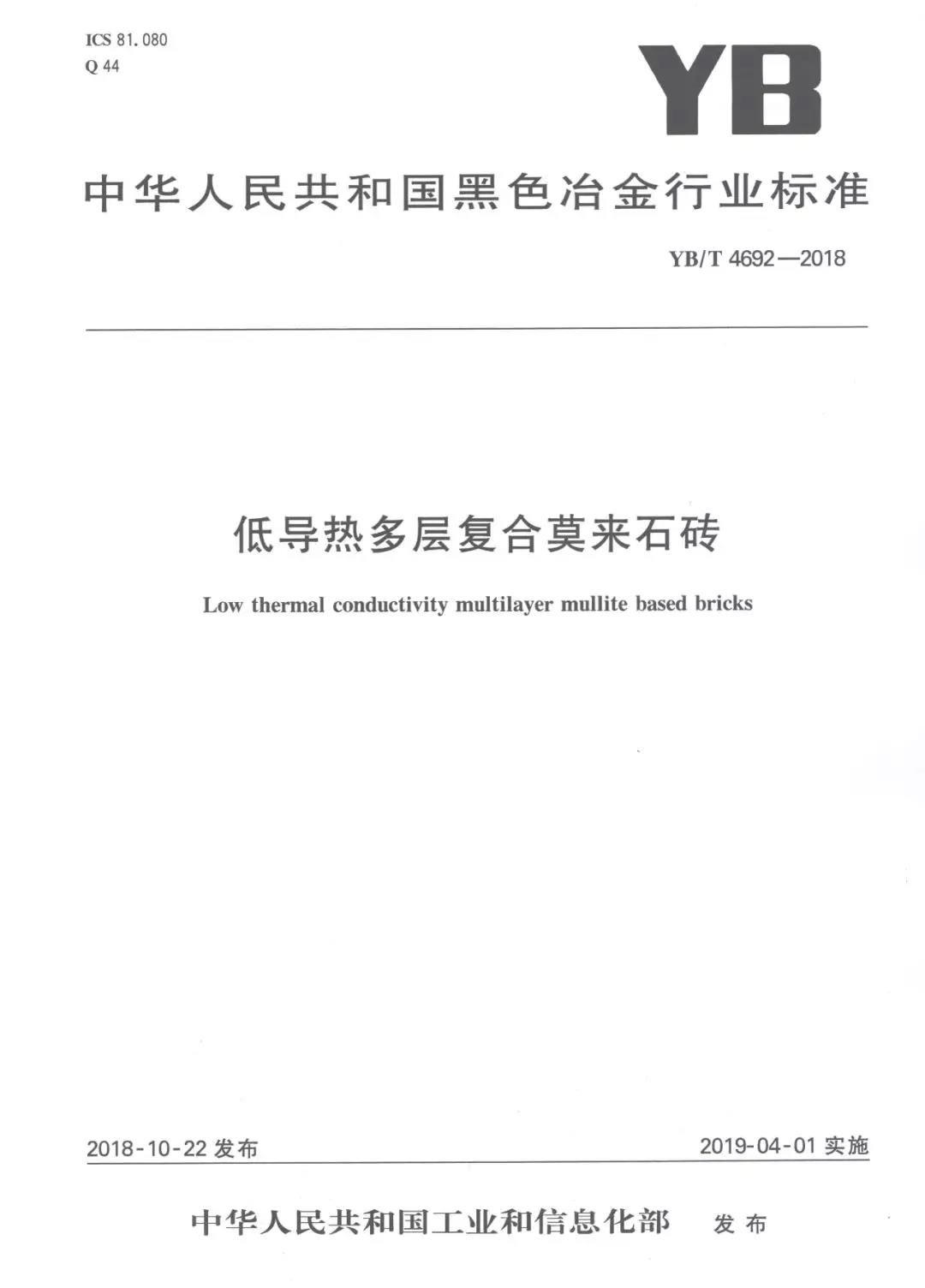 据了解,2019年10月14日是第50届世界标准日,就在当天,由郑州瑞泰耐火科技有限公司主持起草的《低导热多层复合莫来石砖》“YB/T 4692-2018”国家行业标准,正式由中华人民共和国工业和信息化部发售纸质单行本。