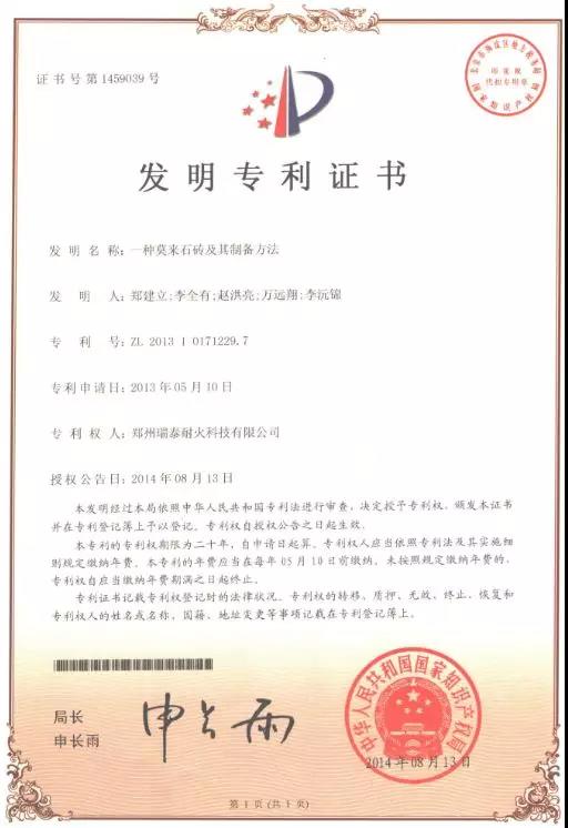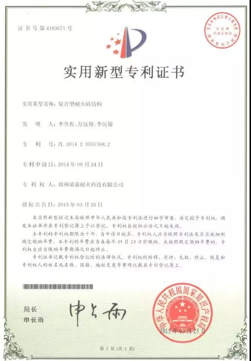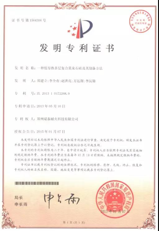 得益于郑州瑞泰前期缜密的市场调研和高瞻远瞩的战略布局,早在10年前,低导热多层复合莫来石砖就开始了研究,通过3年的研究及小批量试验,终于在2012年中旬开始批量推广应用,2013年申请获得了3项发明专利,1项实用新型专利及2项外观专利,是国内乃至世界上耐火材料行业首先攻克多层材料膨胀系数不一致导致结合部位开裂难题的厂家,同时也是多层复合节能型产品量产推广第一家。 2015年7月底郑州瑞泰研制的低导热多层复合莫来石砖通过了河南省科技厅组织的科技成果鉴定,参与鉴定专家一致给予该产品较高的评价,认为其综合技术水平达到了国际领先水平。次年该产品更是获得了河南省科技进步奖三等奖、郑州市科技进步奖一等奖、中国建材联合会科技进步奖二等奖,这些奖项的获得给郑州瑞泰带来的不仅仅是荣誉,更是对该节能型产品的认可。 经过7年多国内外数百家水泥企业客户使用印证,郑州瑞泰研究的这种低导热多层复合莫来石砖使用安全可靠,没有一例使用过程中从结合部位开裂的案例,并且隔热效果明显,客户使用后同比条件下均能比硅莫砖降低50~80℃,吨水泥煤耗可降1.5~2Kg。很多客户使用至后期时发现该节能产品比相邻硅莫砖温度低了60~90℃,相同部位使用寿命平均比硅莫砖高2~3个月,再次证明该节能型产品的隔热效果为使用全周期,隔热效果并未因使用时间变长而变差。 郑州瑞泰近些年通过大量客户使用数据反馈,不断优化产品配比及结构性能,为客户带了使用更加安全,节能效果更佳显著,品种更加丰富的节能型产品。在低导热多层复合莫来石砖国家行业标准发布前期,郑州瑞泰更是凭借该产品获得中国建材集团“壮丽70年,世界之最”十四项重大项目之一。 这些荣誉的获得激励着郑州瑞泰人朝着“绿色发展、行业引领”不断前行。