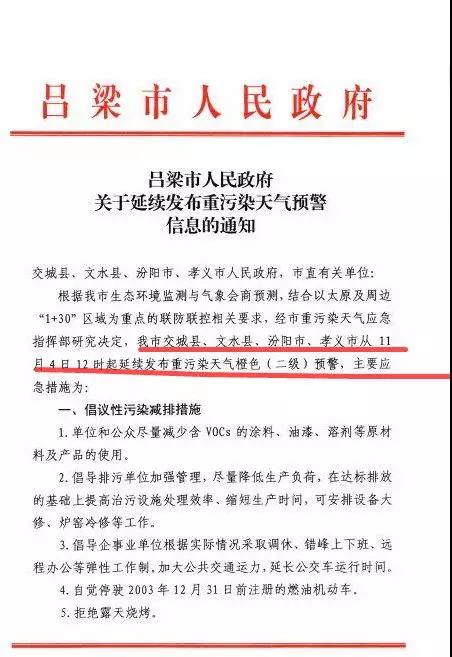 根据朔州市重污染天气专家委员会研判会商结果,2019年11月4日-6日,我市市区受偏南气流影响,风力较小,扩散条件较差,市区空气质量以轻至中度污染为主,短时可能出现重度污染,11月7日,市区空气质量以良为主。市重污染天气应急指挥部决定从2019年11月4日0时-11月6日18时升级重污染天气为橙色预警,同时启动Ⅱ级响应。现将有关管控措施通知如下: