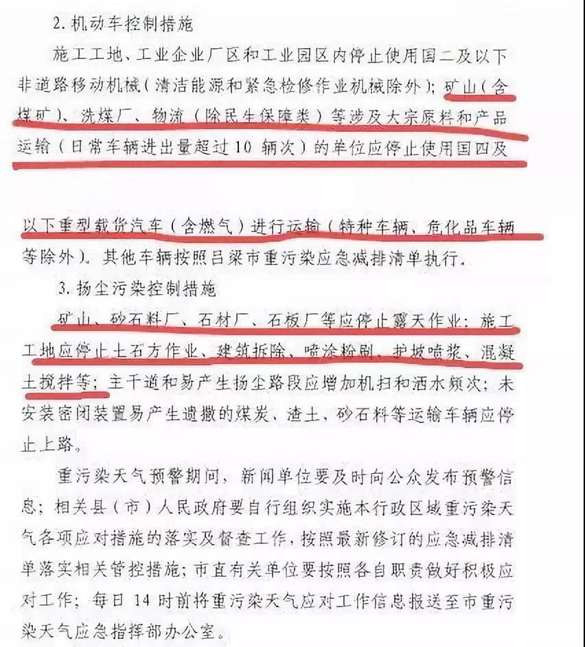 在保障城市正常运行的前提下:(一)工业企业减排措施。工业企业按“工业源减排清单”执行橙色预警减排措施,县(市、区)政府、各有关部门和应急减排督导检查组加强对橙色预警管控企业及供热站、电力生产和供应等保障类企业督导检查,确保减排措施执行到位。(二)移动源减排措施。1、施工工地、工业企业厂区及工业园内停止使用国二及以下非道路移动机械(清洁能源和紧急抢修作业机械除外)。2、矿山(含煤矿)、洗煤厂、物流(除民生保障类)等涉及大宗物料运输(日常车辆进出超过10辆次)的单位停止使用国四及以下重型载货车(含燃气)进行运输(特种车辆、危化品车辆等除外)。3、有色、电力、化工、煤炭、玻璃等重点行业涉及大宗物料运输的企业按照“工业源减排清单”中橙色预警车辆运输减排要求执行。4、在高速环内实行交通管控,除运输瓜果蔬菜等新鲜农产品车辆及清障、环卫、园林、道路养护等专项作业车辆除外,禁止中重型载货车通行。5、公安交警部门严格车辆管控,对进入建成区黄标车、冒黑烟车进行查扣处罚,对重型柴油货车和散装物料运输车要严格实行道路绕行。(三)扬尘源和挥发性减排措施。1、除应急抢险外,市区所有房屋建筑、拆迁、市政、道路、水利、绿化、通讯等施工工地停止土石方作业、建筑拆除、护坡喷浆、混凝土搅拌以及露天切割、打磨、喷涂、粉刷等全部停止作业。2、渣土运输车辆、混凝土罐车、砂石运输车禁止通行(生活垃圾运输车辆除外)。省、市重点工程及地铁工地经市政府批准后,可正常施工。3、矿山(除政府协调确定的应急保障类企业外)、砂石料厂、石材厂、石板厂等停止露天作业。4、城市主干道路和易产生扬尘路段应增加机扫和洒水频次。