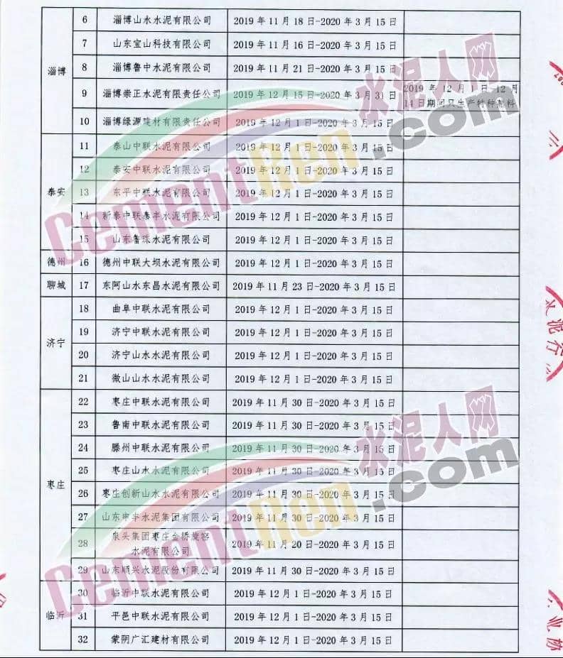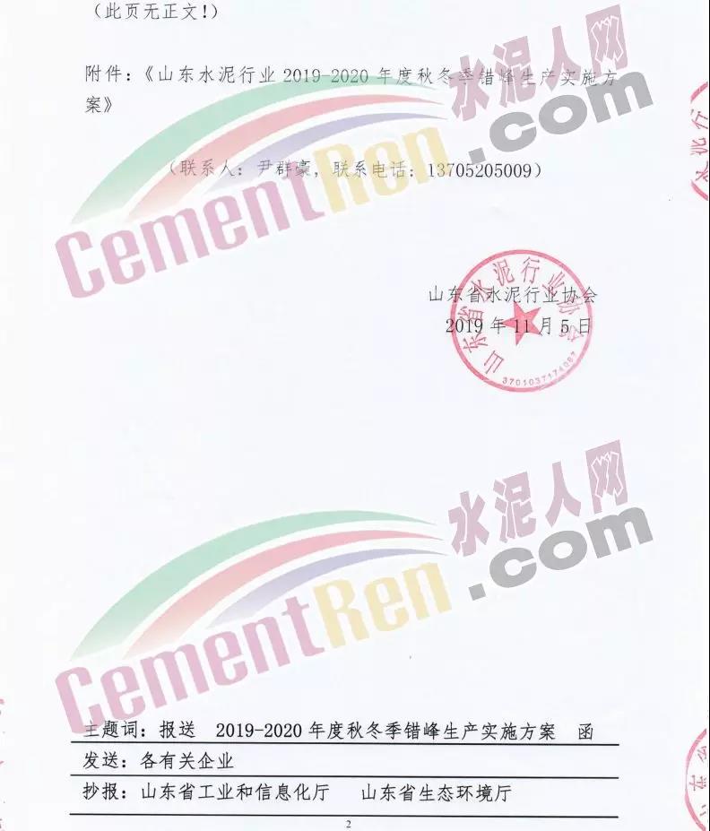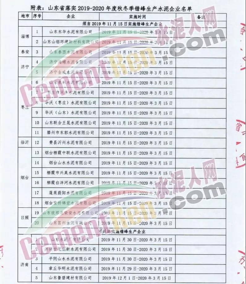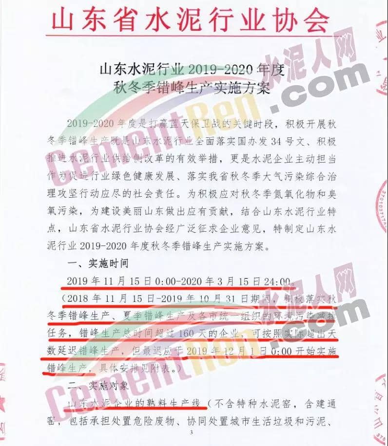 一、实施时间: 2019年11月15日0时-2020年3月15日24时。(2018年11月15日-2019年10月31日期间,积极落实秋冬季错峰生产、夏季错峰生及各市统一组织的环境污染减排任务,错峰生产总时间超过160天的企业,可按照实际超出天数延迟错峰生产,但最迟应于2019年12月1日0时开始实施错峰生产,具体安排见附表。)二、实施对象: 山东水泥企业的熟料生产线(不含特种水泥窑,含建通窑,包括承担处置危险废物、协同处置城市生活垃圾和污泥、居民供暖等保民生任务的生产线,下同)。(企业名单见附表); 错峰生产期间各市、县(市、区)人民政府及工信环境部门组织粉磨站和特种水泥窑采取停产减排措施的,按照各市、县(市、区)人民政府及相关部门文件执行。三、保障措施 1、原则上水泥企业不再承担保民生任务。有特殊情况需承担民生任务的,实行“一事一报”,相关企业于2019年11月6日前向所在市工信部门提交申请方案,接受申请的市工信部门联合市环境部门于2019年11月9日前向社会公示申请方案,并报本市人民政府审批,批准后于2019年11月12日前分别报山东省工业和信息化厅、山东省生态环境厅备案。 2、承担保民生任务的企业于2019年11月12日前将申请方案和市人民政府批准文件报山东省水泥行业协会备案。 3、秋冬季错峰生产期间承担保民生任务企业的减排任务不得豁免,相关企业申请保民生任务的方案中必须包括秋冬季错峰生产结束后补齐错峰生产时间的计划安排,且补停窑时间不冲抵山东省水泥行业协会组织的2020年夏季及特殊天气情况下组织的水泥企业不少于40天的错峰生产时间。全文如下: