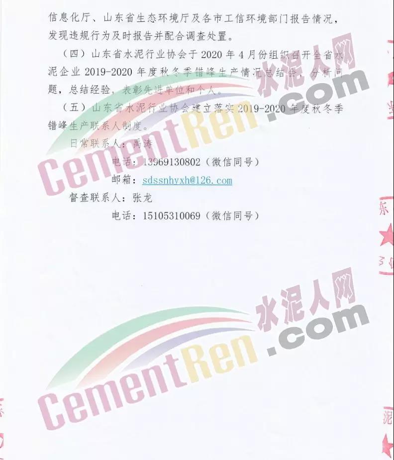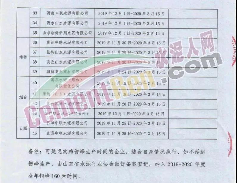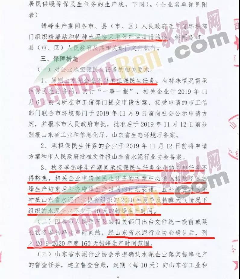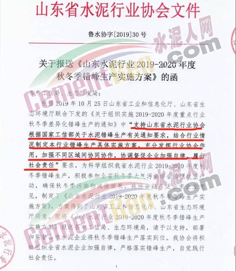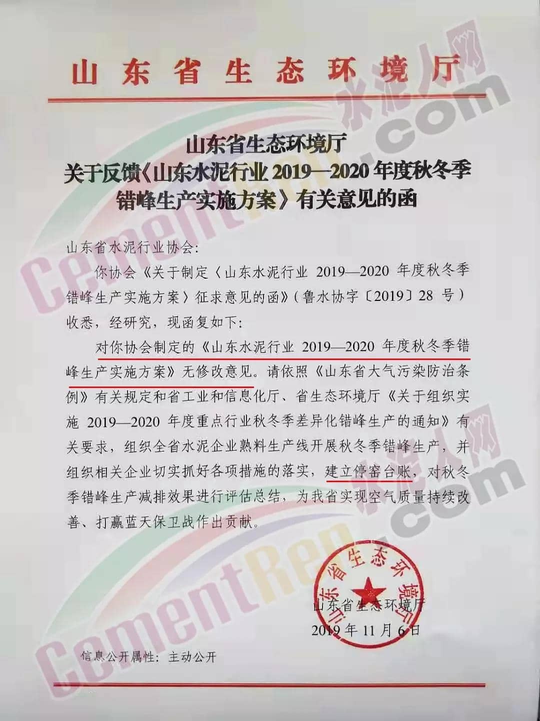 一、实施时间: 2019年11月15日0时-2020年3月15日24时。(2018年11月15日-2019年10月31日期间,积极落实秋冬季错峰生产、夏季错峰生及各市统一组织的环境污染减排任务,错峰生产总时间超过160天的企业,可按照实际超出天数延迟错峰生产,但最迟应于2019年12月1日0时开始实施错峰生产,具体安排见附表。)二、实施对象: 山东水泥企业的熟料生产线(不含特种水泥窑,含建通窑,包括承担处置危险废物、协同处置城市生活垃圾和污泥、居民供暖等保民生任务的生产线,下同)。(企业名单见附表); 错峰生产期间各市、县(市、区)人民政府及工信环境部门组织粉磨站和特种水泥窑采取停产减排措施的,按照各市、县(市、区)人民政府及相关部门文件执行。三、保障措施 1、原则上水泥企业不再承担保民生任务。有特殊情况需承担民生任务的,实行“一事一报”,相关企业于2019年11月6日前向所在市工信部门提交申请方案,接受申请的市工信部门联合市环境部门于2019年11月9日前向社会公示申请方案,并报本市人民政府审批,批准后于2019年11月12日前分别报山东省工业和信息化厅、山东省生态环境厅备案。 2、承担保民生任务的企业于2019年11月12日前将申请方案和市人民政府批准文件报山东省水泥行业协会备案。 3、秋冬季错峰生产期间承担保民生任务企业的减排任务不得豁免,相关企业申请保民生任务的方案中必须包括秋冬季错峰生产结束后补齐错峰生产时间的计划安排,且补停窑时间不冲抵山东省水泥行业协会组织的2020年夏季及特殊天气情况下组织的水泥企业不少于40天的错峰生产时间。全文如下: