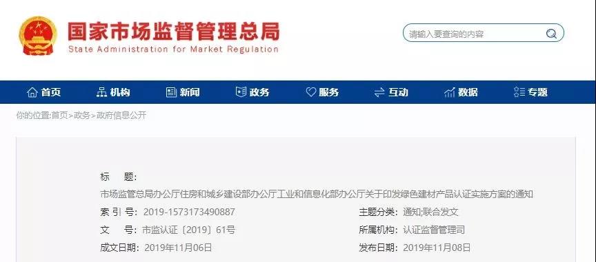市场监管总局办公厅 住房和城乡建设部办公厅工业和信息化部办公厅关于印发绿色建材产品认证实施方案的通知市监认证〔2019〕61号 各省、自治区、直辖市及新疆生产建设兵团市场监管局(厅、委)、住房和城乡建设厅(委、局)、工业和信息化主管部门:
