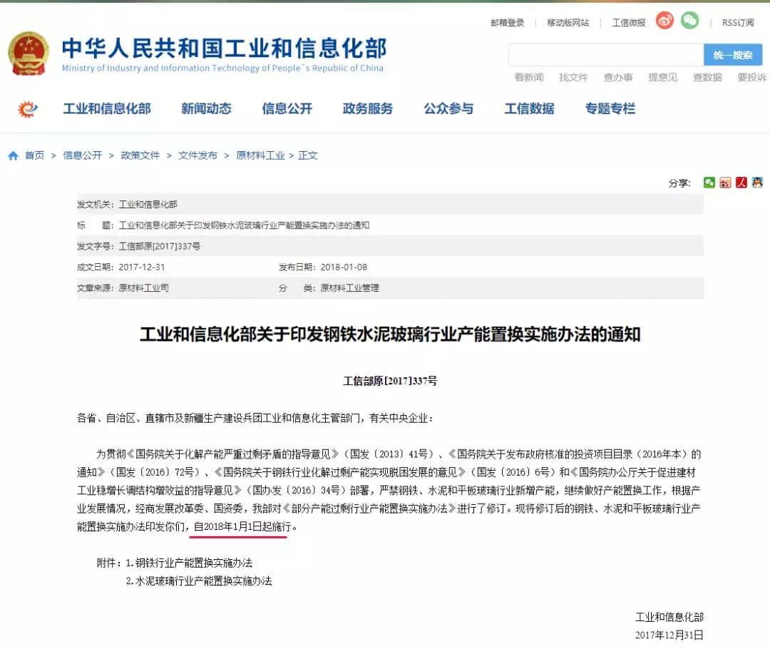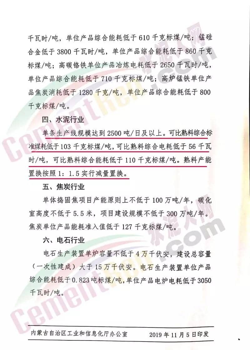 通知提到水泥行业单条生产线规模达到2500t/d及以上,可比熟料综合标准煤耗低于103千克标煤/吨,可比熟料综合电耗低于56千瓦时/吨,可比熟料综合能耗低于110千克标煤/吨。熟料产能置换按照1:1.5实行减量置换。通知原文如下: