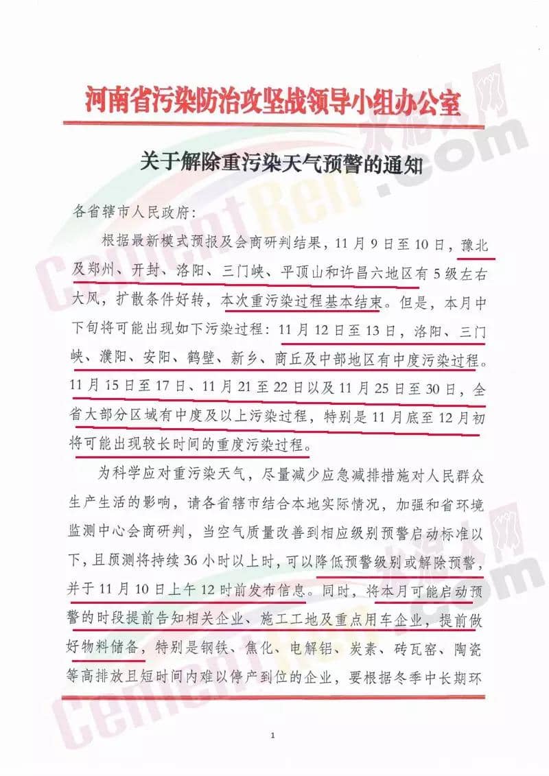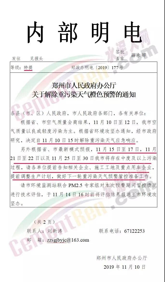 另外根据省、市最新模式预报,11月15日至17日,11月21日至22日以及11月25日至30日郑州市将存在中度及以上污染过程,请各单位提前告知相关企业、施工工地及重点用车企业,提前调整生产计划,做好下一轮重污染天气预警管控准备工作。文件原文如下: