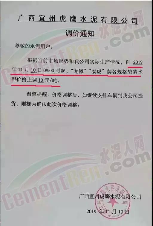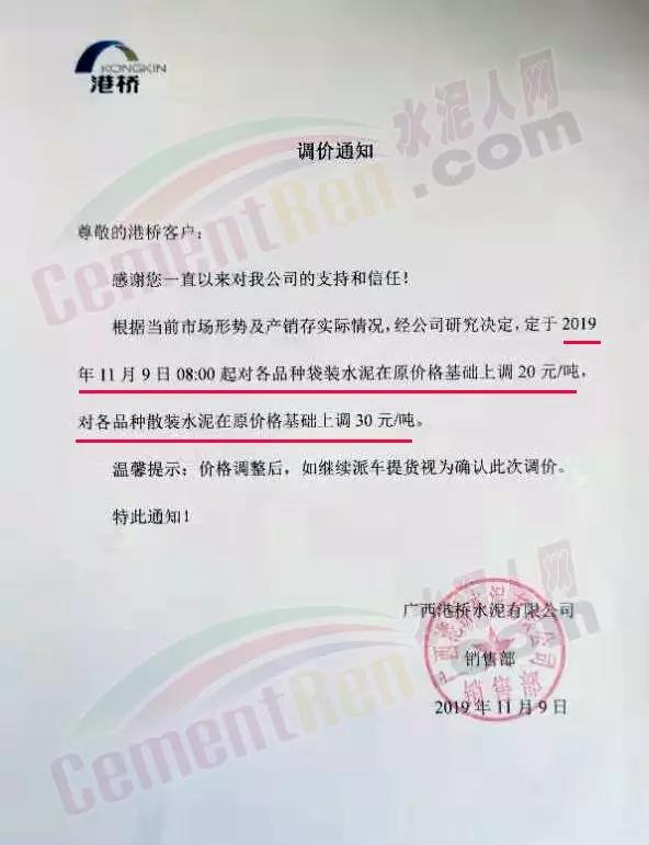 由于目前原材料上涨,成本升高的原因。故此将我厂品牌水泥:统一上调30元/吨。调整时间定于:2019年11月10日15点00分,谢谢!