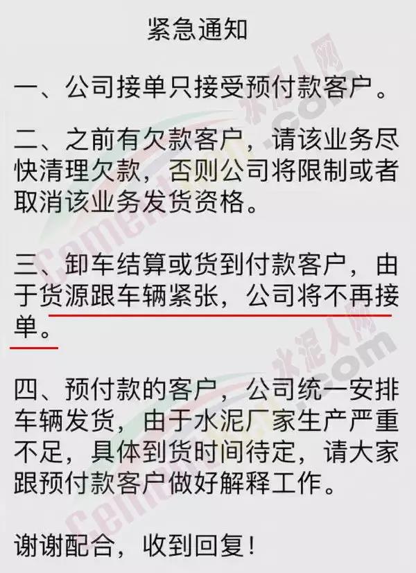 很多水泥物流师傅在水泥门口日夜排队的时候,却被水泥厂“无情的”告知,只接受预付款客户,之前欠款客户未清理欠款的将限制或取消发货资格,卸车结算或货到付款客户,由于货源、车辆紧张,公司将不再接单。预付款的客户公司统一安排车辆发货,由于水泥厂家生产严重不足,具体到货时间待定。