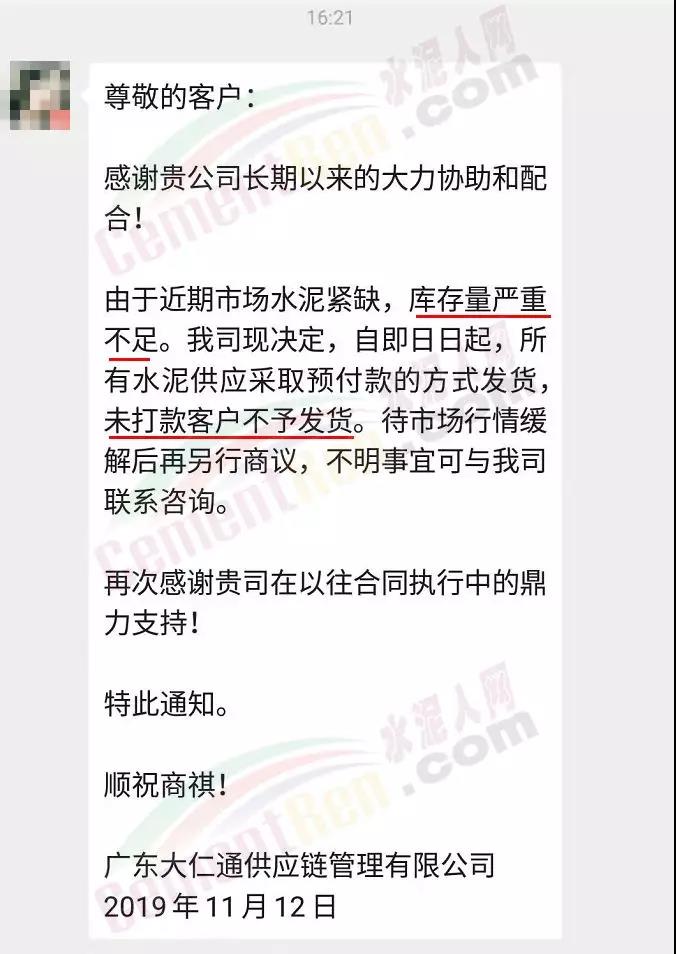 广东大仁通供应链管理有限公司发布通知称:由于近期市场水泥紧缺,库存量严重。该公司决定,自即日起,所有水泥供应采取预付款的方式发货,未打款客户不予发货。待市场行情缓解后再另行商议。