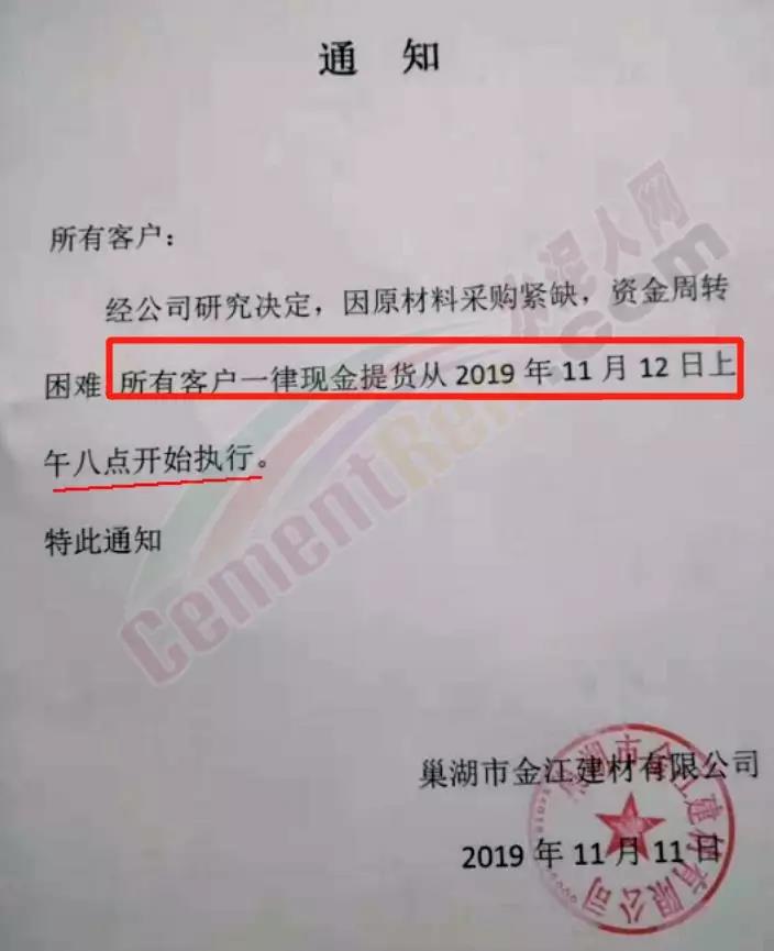 同时,巢湖市金江建材有限公司通知,因原材料采购紧缺,奖金周转困难,所有客户一律现金提货,从12日上午八点开始执行。