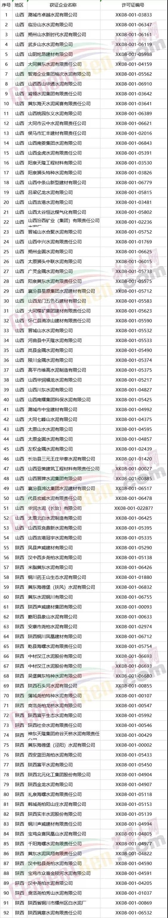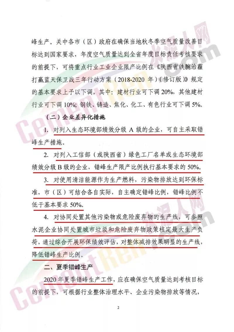 (一)对满足环保排放要求且污染物排放总量小、对稳增长、稳就业、稳外贸等影响大的生产工序,可适度减少错峰。 (二)对承担供气、供热等民生任务的保障类企业,可根据供气、供热需求优化错峰生产比例。 (三)完成治理任务且列入工业和信息化部绿色工厂示范的企业、污染物排放达到超低排放标准(没有超低排放标准的行业,污染物排放低于行业特别排放限值20%以上)且物料运输采用铁路运输或其他清洁运输方式的企业(其中,焦化企业必须采取干法熄焦)、满足生态环境部《关于加强重污染天气应对夯实应急减排措施的指导意见》要求的A级企业,可列入豁免清单,不参与错峰。 (四)对产业结构指导目录中限制类和环保绩效差的要提高错峰限产比例或实施停产。 (五)错峰生产要与重污染天气应急减排措施相衔接,保证重污染天气应急减排需要,对于重污染天气应急预警不可临时中断的生产线或生产工序,减排量可通过提前采取错峰生产措施予以落实。各市要根据以上规定和错峰生产重点领域进一步完善落实错峰生产方案。 据水泥人网了解,山西区域多个城市此前都发布了错峰生产计划,要求辖区内水泥企业从 2019年10月1日00时至2020年3月31日24时实施错峰生产。水泥企业完成无组织治理和特别排放限值改造的限产50%,未完成的停产整治。附山西、陕西区域水泥熟料生企业名单: