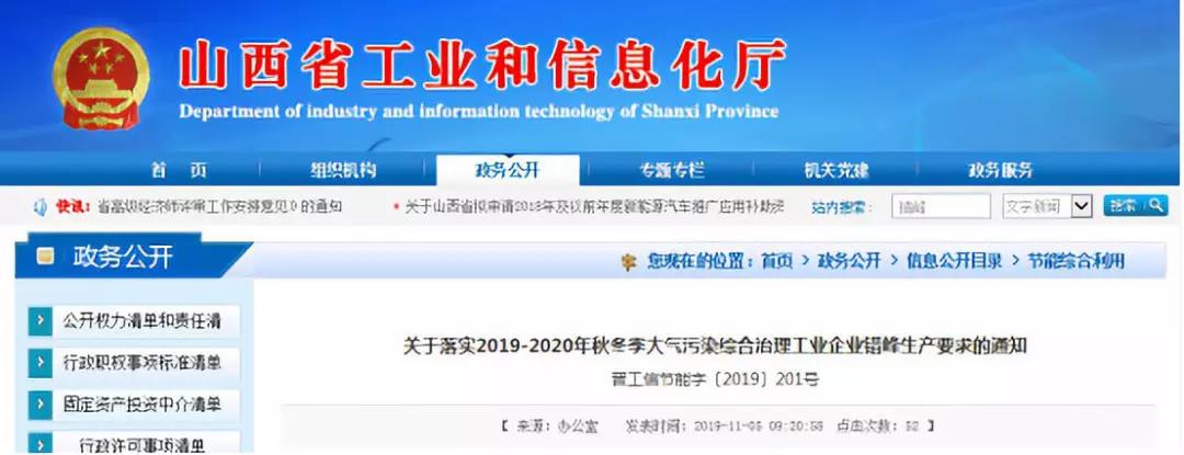 同属汾渭平原,近日山西省工业和信息化厅山西省生态环境厅也发布了关于《关于落实2019-2020年秋冬季大气污染综合治理工业企业错峰生产要求的通知》