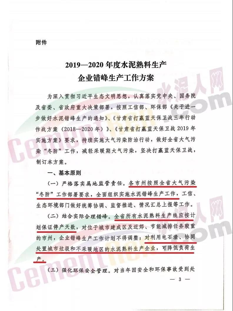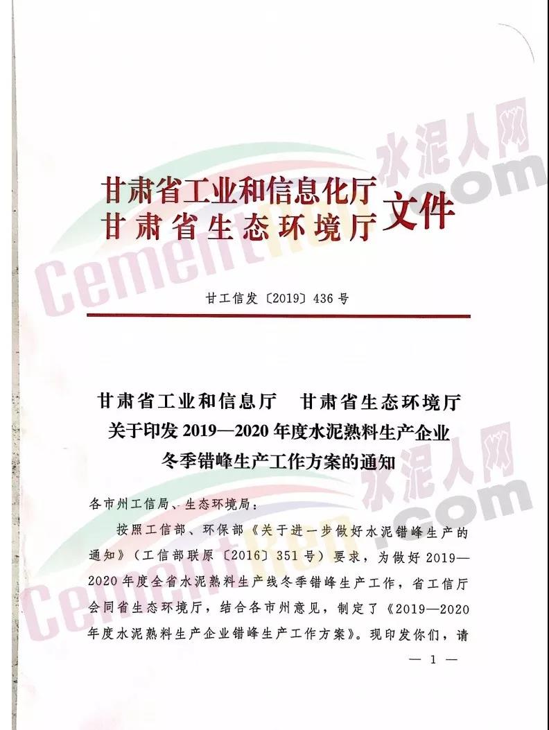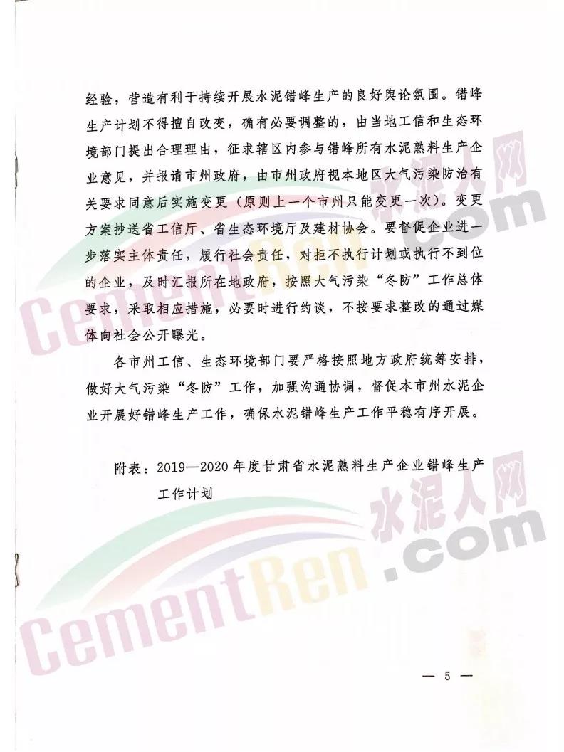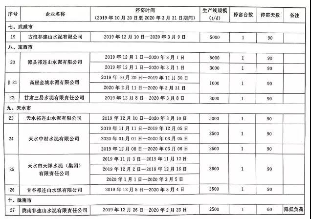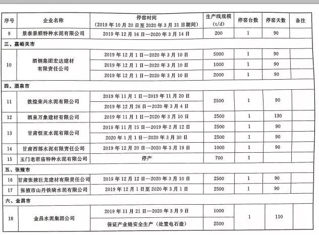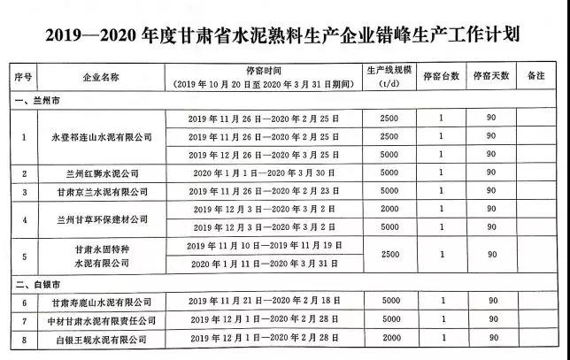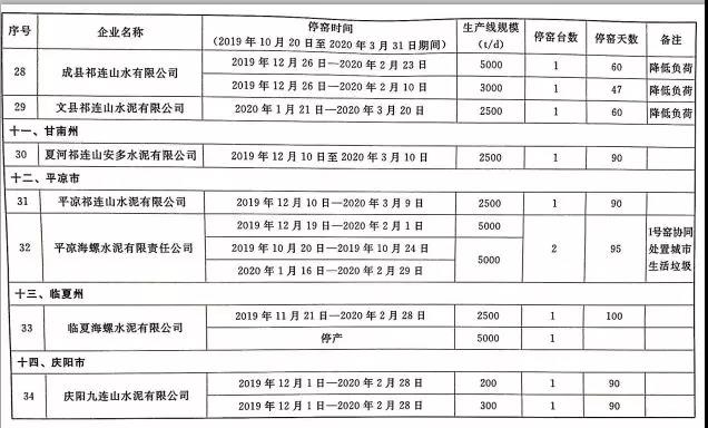 2019~2020年度甘肃省水泥熟料生产企业错峰生产工作计划,其中涉及34家水泥企业,名单如下:
