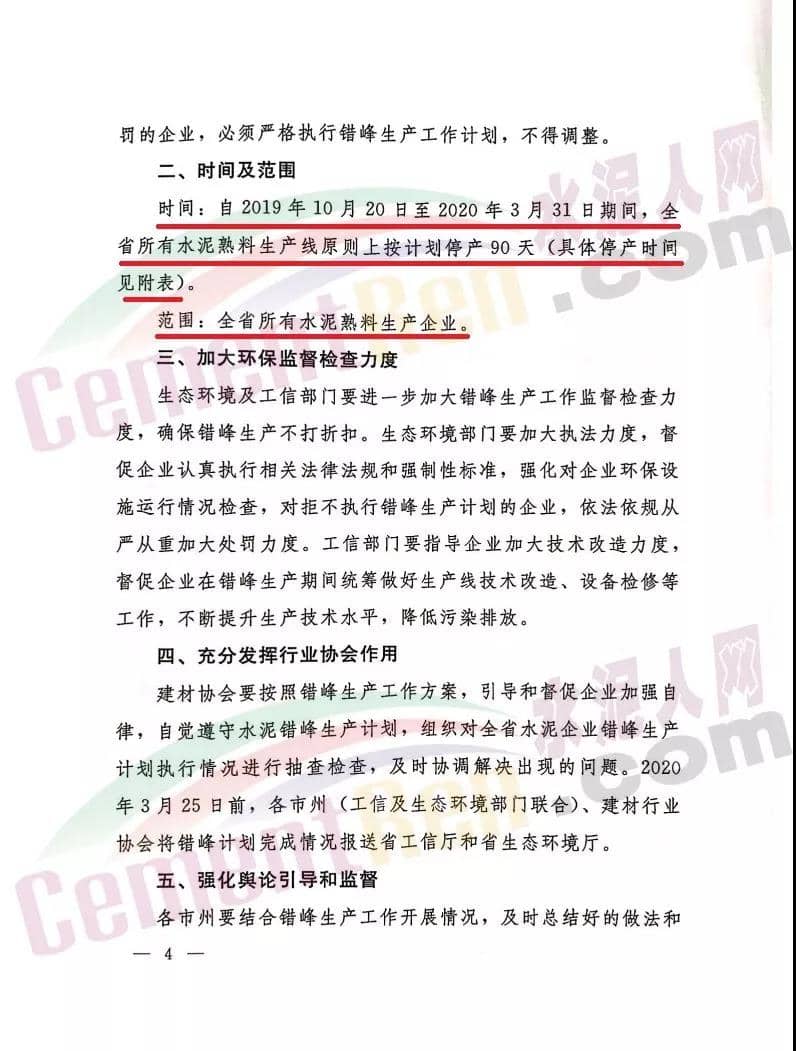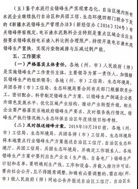 根据新疆建材行业协会发布的关于2019-2020年水泥行业错峰生产的通知要求,全疆所有水泥生产企业(含兵团)按文件要求执行错峰停窑。除和田地区从2019年12月1日零时起,其他各地州(市)从2019年11月1日零时起执行冬季采暖期错峰生产,停窑时间少于采暖期时间应予顺延或补齐,2019-2020年具体错峰停容时间各地有所差异,其他应对重污染天气时要按应急响应机制要求停窑。结合各地冬季采暖季、春季扬沙天气等减排环保要求,以及当地水泥产能过剩、电石渣水泥不同生产等实际情况,依据《关于2018-2019年冬季水泥错峰生产的通知》(新缰)错峰停窑时间。