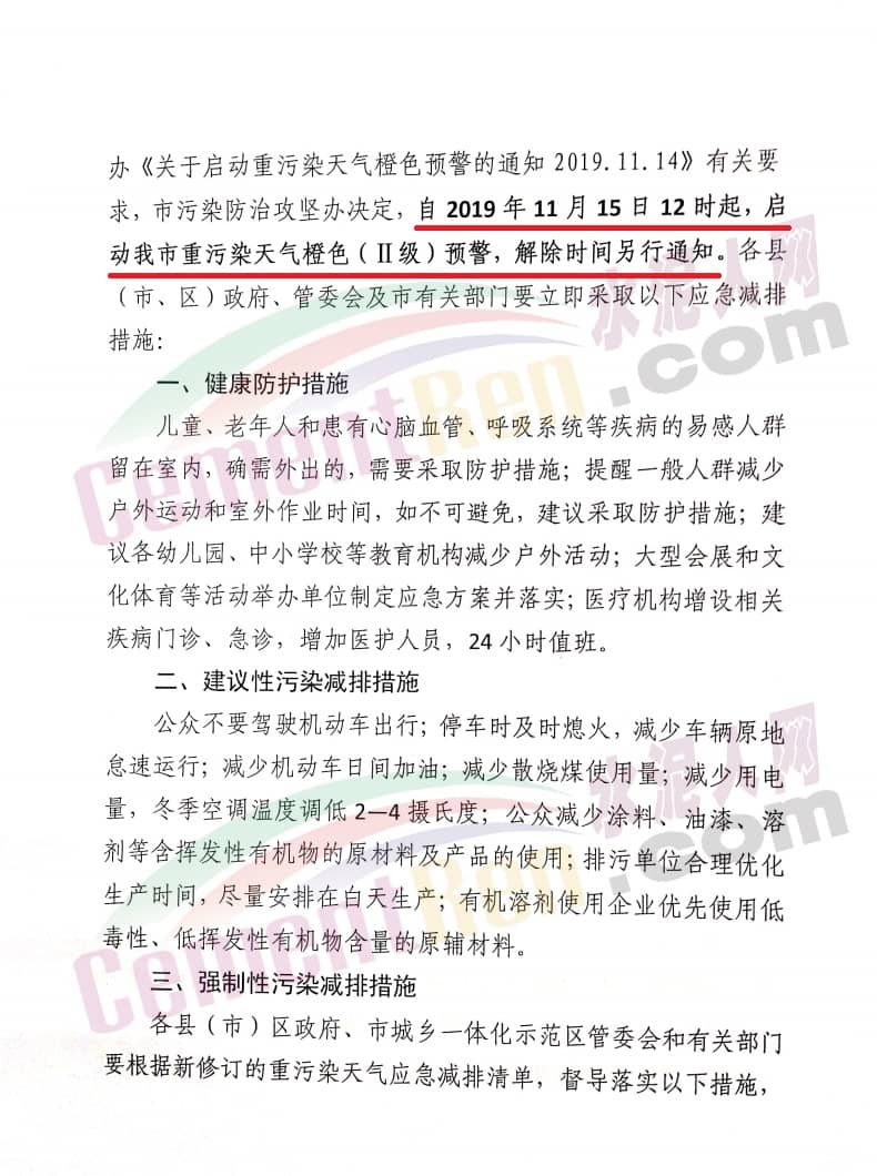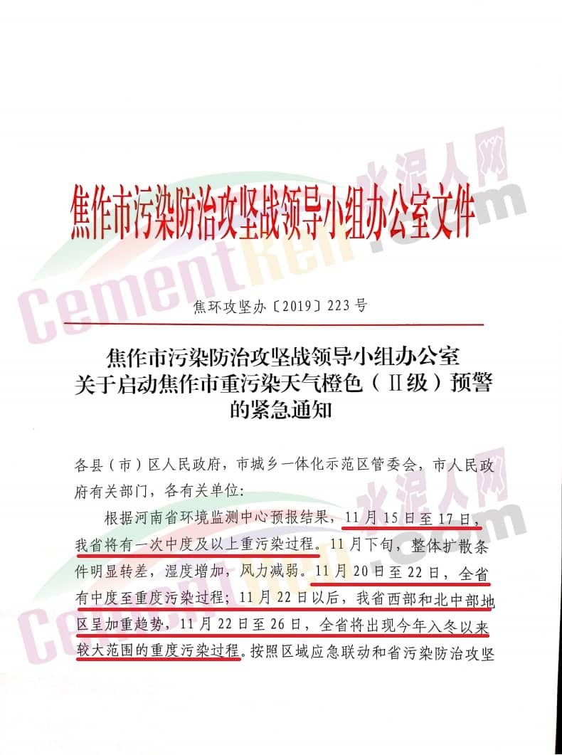 11月15日,焦作市生态环境局发布了《焦作市污染防治攻坚战领导小组办公室关于启动焦作市重污染天气橙色(Ⅱ级)预警的紧急通知 》称自2019年11月15日12时起,启动重污染天气橙色(Ⅱ级)警,解除时间另行通知。通知原文如下: