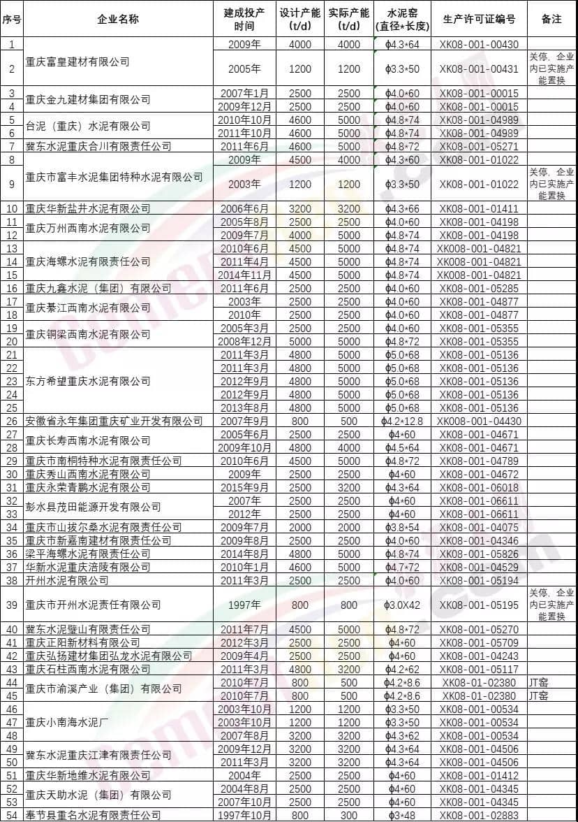 其中重庆市渝溪产业(集团)有限公司两条JT窑熟料生产线,涉及熟料产能48万吨/年。重庆市开州水泥责任有限公司、重庆市富丰水泥集团特种水泥有限公司、重庆富皇建材有限公司属于所涉及生产线已实施产能置换,所涉及退出产能共计96万吨/年。详情如下: