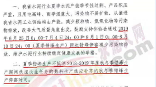 2019年全年错峰停产主要是河南、山东、河北、辽宁、黑龙江、山西、陕西、内蒙古8个省自治区,最长停产天数为河北省185天,尤其是河北省唐山地区,基本上月月都有停产的情况。一停就是半月,不执行错峰停产水泥企业,处十万元以上一百万元以下罚款;情节严重的,报经有批准权的人民政府批准,责令停业、关闭。企业小半年的时间都处于停产状态,水泥企业时常出现了水泥库存告急,缺货,价格持续走高的情况。