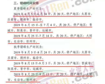 秋季错峰生产时间为两个阶段:2019年8月5日-8月24日,共20天,停产地区:太原市、吕梁市、朔州市、临汾市。2019年8月15日至9月3日,共20天,停产地区:晋城市、阳泉市、晋中市、运城市。2019年8月25日-9月13日,共20天,停产地区:大同市、长治市、忻州市。