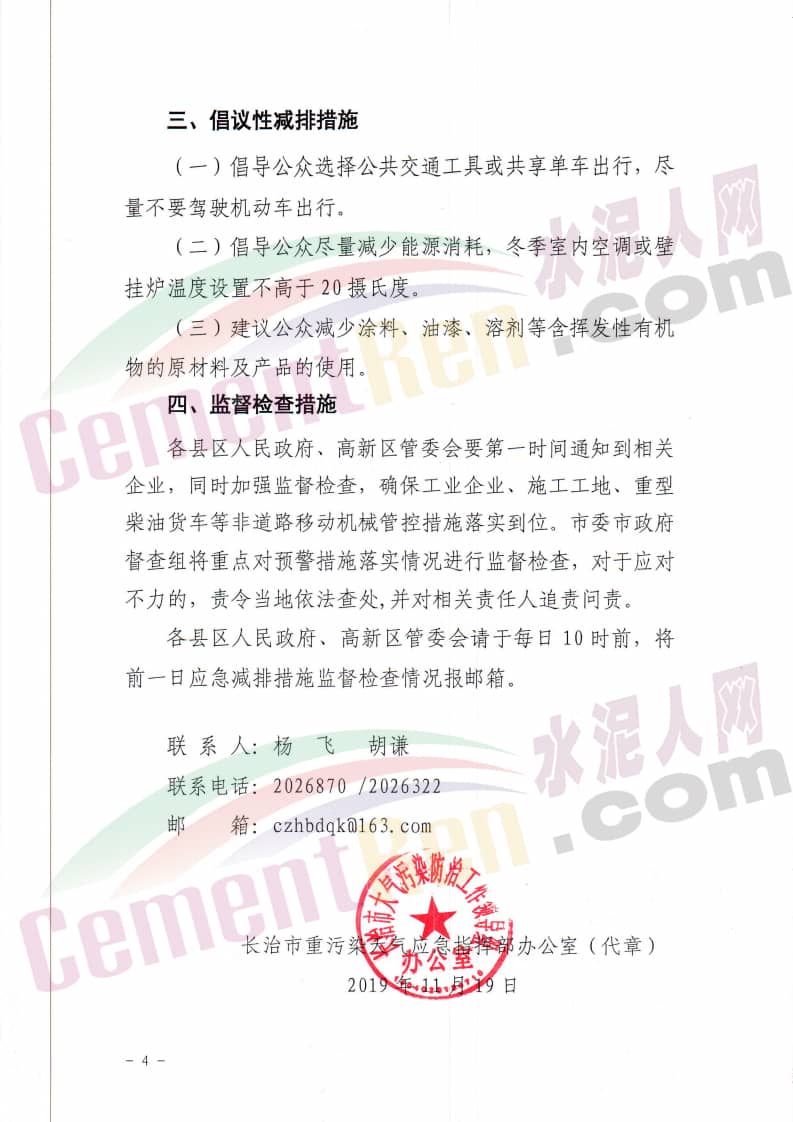 11月18日,山西省大气污染防治工作领导组办公室发布了《应对重污染天气调度令》称,根据山西省环境空气质量实时监测数据、气象数据以及与中国环境监测总结、省气象相关部门会商预测,11月20日-22日,湿度较大,扩散条件逐步转差,全省范围可能出现一次中度及以上污染过程,影响范围包括太原、晋中、临汾、晋城、运城、长治等城市,22日夜间至23日上午污染最重,PM2.5浓度峰值可达180-220微克/立方米;23日午后、受冷空气影响,空气质量自北向南逐渐好转,太原、晋中、临汾、晋城、运城、长治及忻州“1+30”区域,吕梁“1+30”区域于11月20日0时至23日24时,启动黄色已经措施。应急减排措施以长治市为例,减排措施如下: