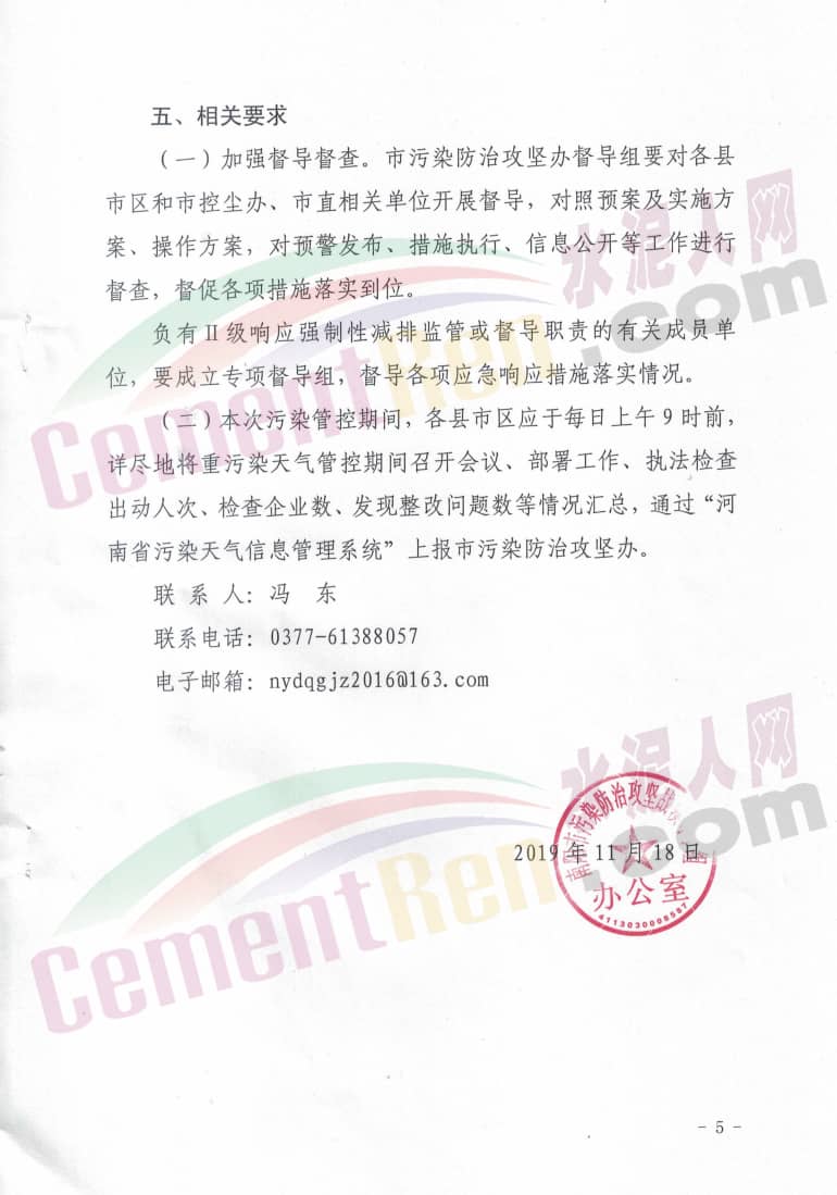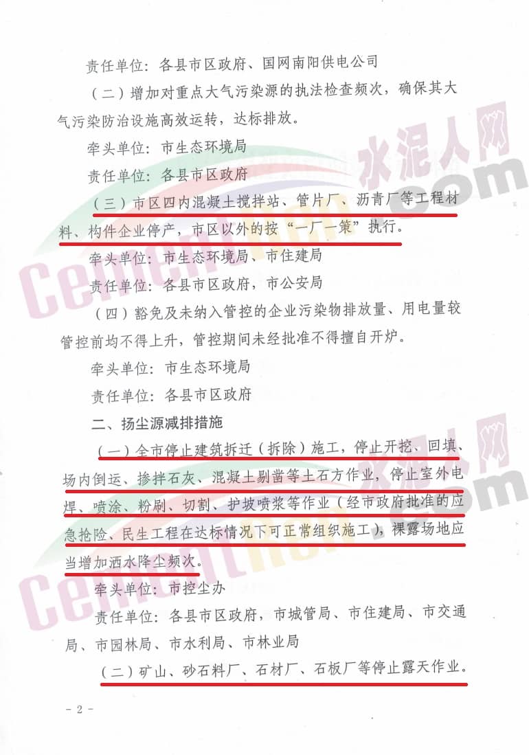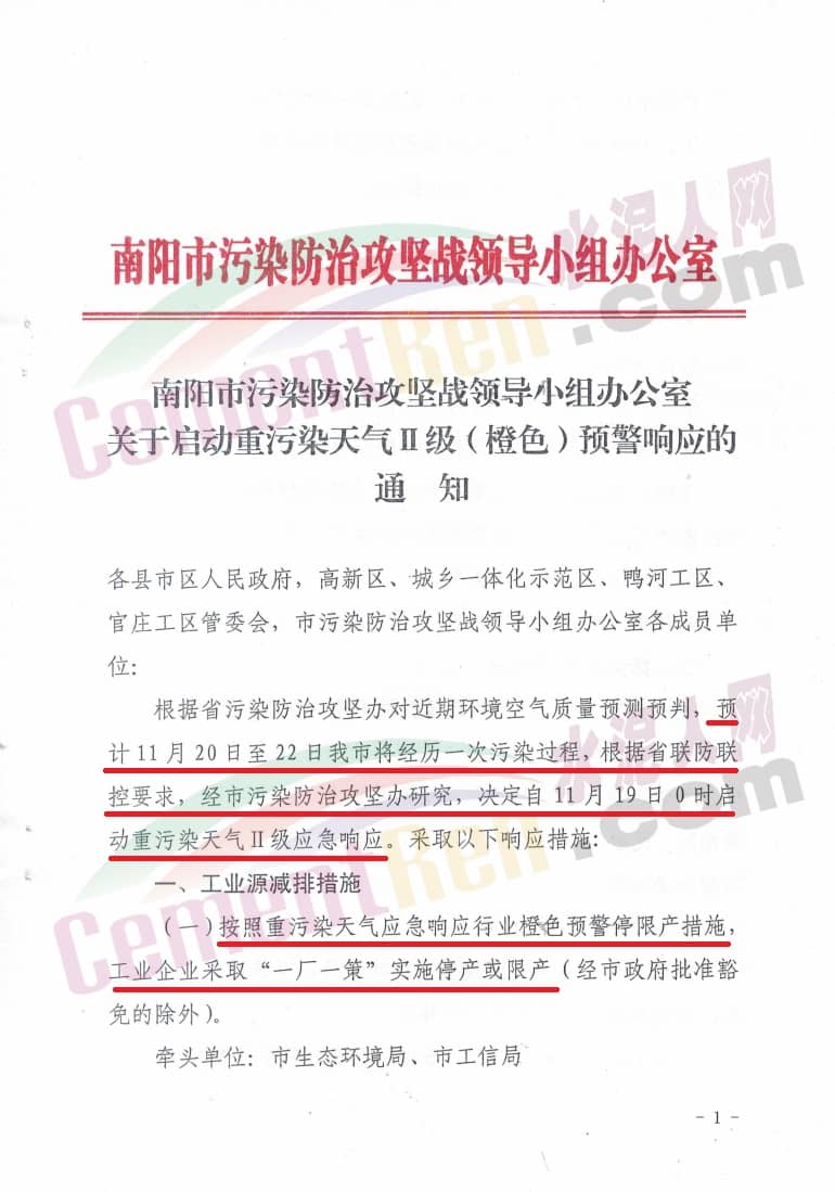 11月18日河南省南阳市相继发布了《关于启动重污染天气二级(橙色)预警响应的通知》称根据省污染防治攻坚办对近期的环境空气质量预测预判,预计11月20日至22日南阳市将经理一次污染过程,根据省联防控要求,经市污染防控攻坚办研究,决定自11月19日0时启动重污染天气二级应急响应,具体减排措施如下: