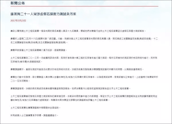 2017年,香港廉政公署收到土木工程拓展署转达的贪污投诉,而后展开调查。17年5月23日,廉署发布新闻稿,证实在港珠澳大桥香港段的建设中,香港土木工程拓展署的一家承包商涉嫌贪污,并向土木工程拓展署提供虚假混凝土压力测试报告。