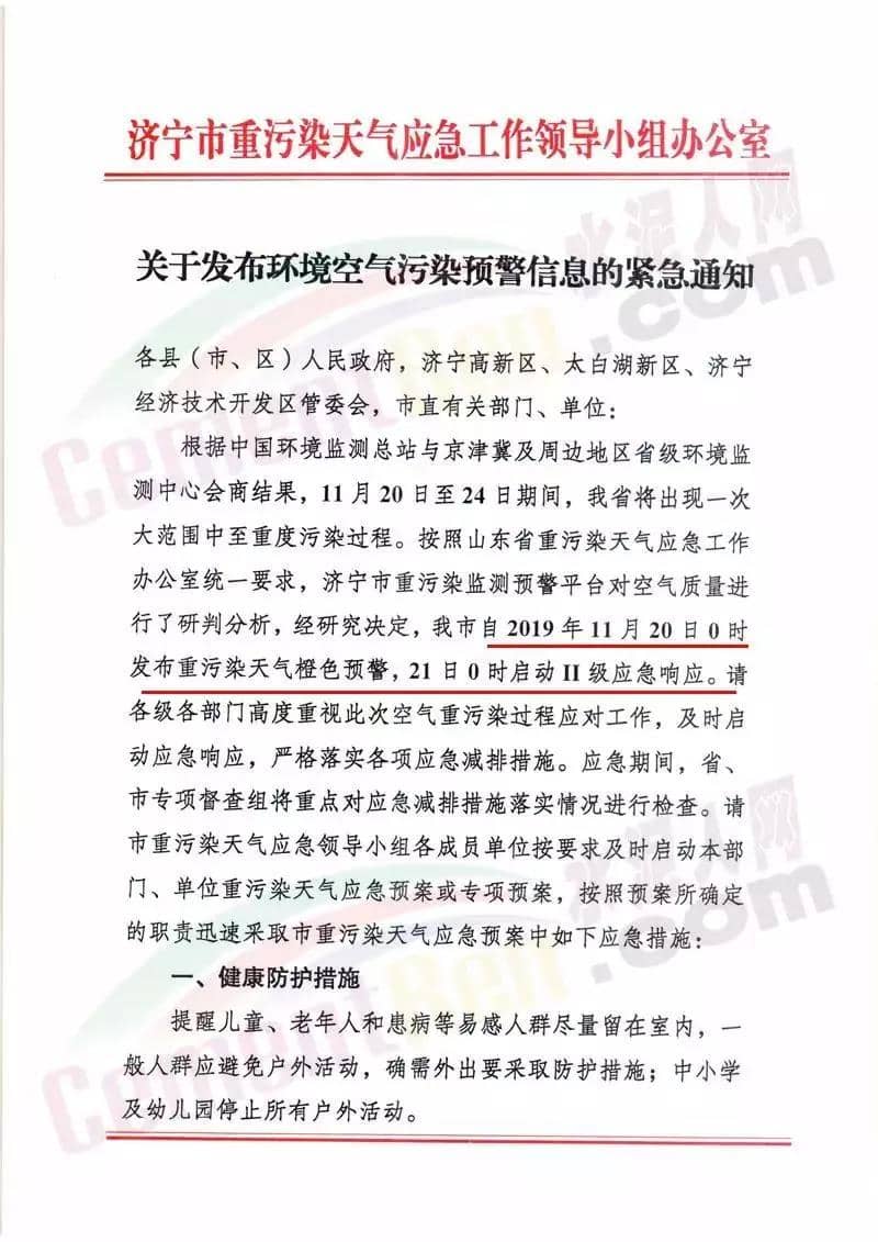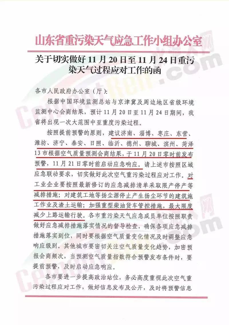 11月19日山东省重污染天气应急工作小组办公室发布通知,建议济南、淄博 、枣庄、东营、维坊、济宁、泰安、日照、临沂、德州、聊城、滨州、菏泽13市根据空气质量预测会商结果,于11月20日零时前发布预警,11月21日零时前应动应急响应。预警期间对工业企业要按照最新修订的应急减排清单采取限产停产等减排措施;对建筑 工地等扬尘源停止产能扬尘环节的建筑施工作业及渣土运输;加强重型柴油货车管控措施,最大限度减少上路运输行驶等。