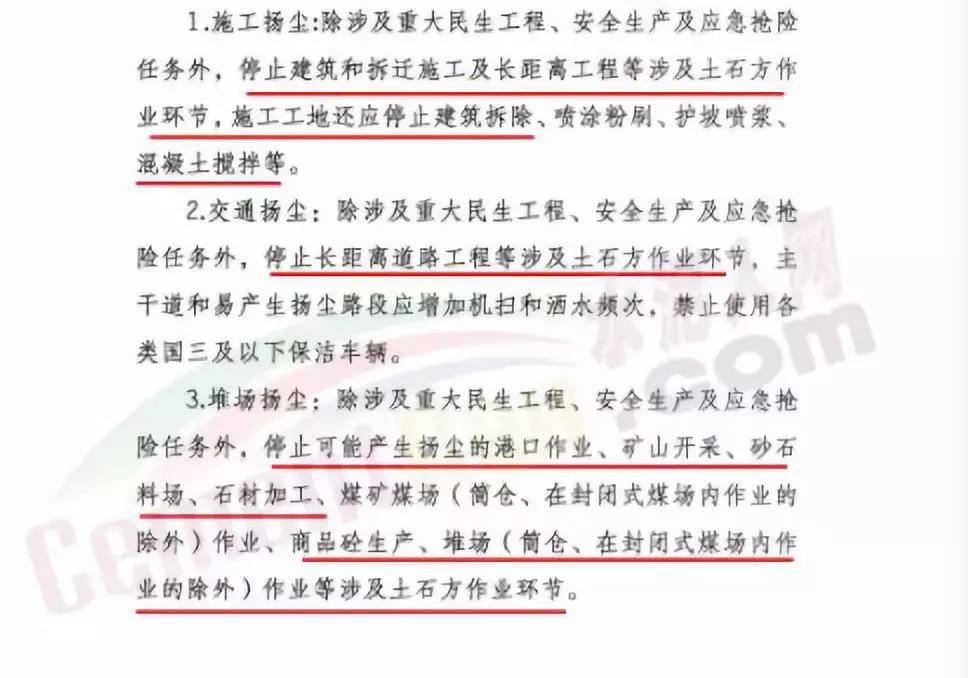 3.除涉及重大民生工程、安全生产及应急抢险任务外,停止所有施工工地的土石方作业(包括停止土石方开挖、回填、场内倒运、掺拌石灰、混凝土剔凿等作业,停止建筑工程配套道路和管沟开挖作业)。