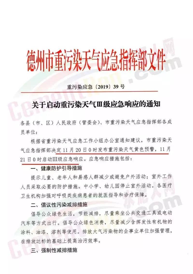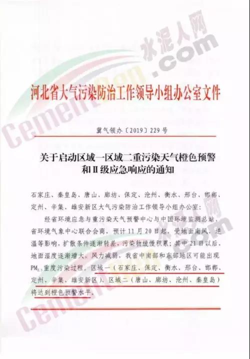 以河北省的“水泥窝”唐山市为例,当地政府于11月19日发布了《关于启动重污染天气Ⅱ级应急响应的通知》称自2019年11月19日20时,全市启动重污染天气Ⅱ级应急响应。