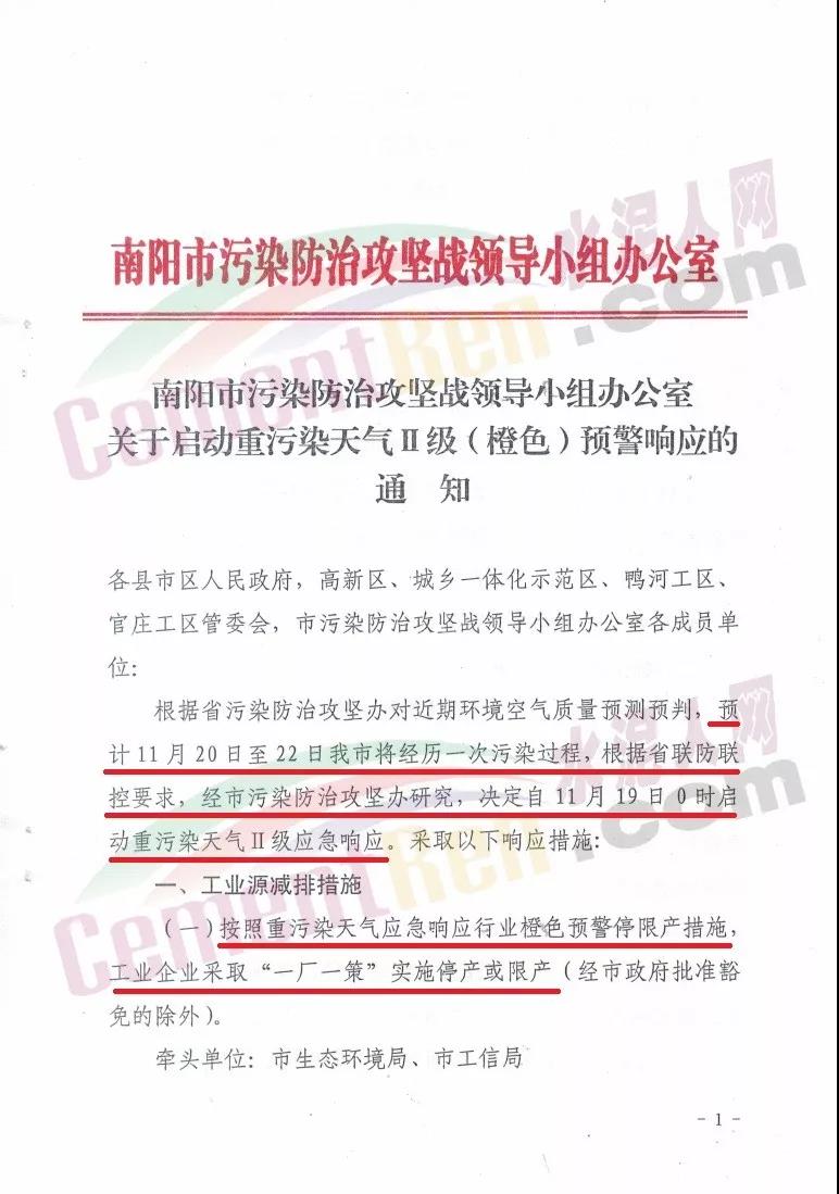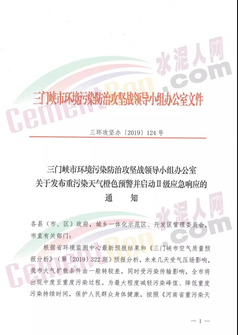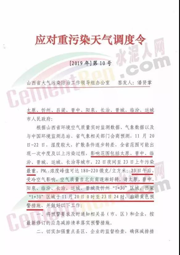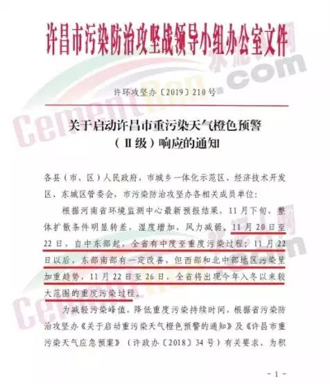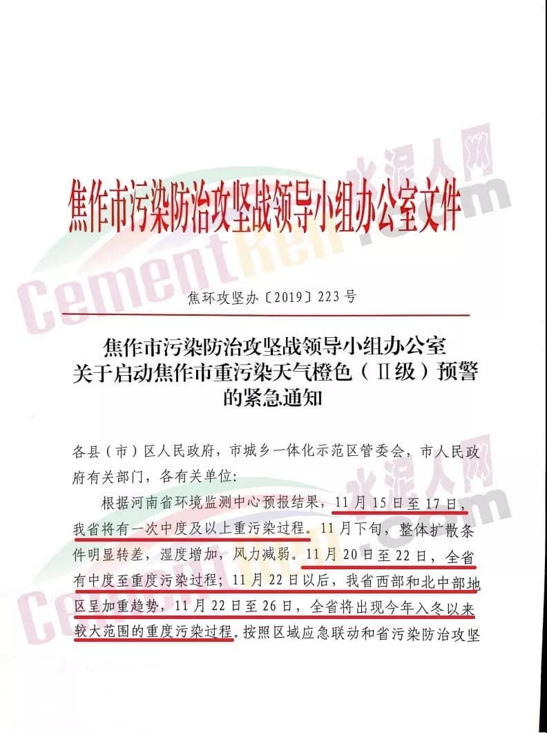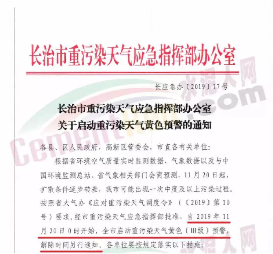 长治市重污染天气应急指按部办公室通知文件要求自11月20日0时开始全市启动重污染天气黄色(III级)预警,要求水泥、建材行业停产。