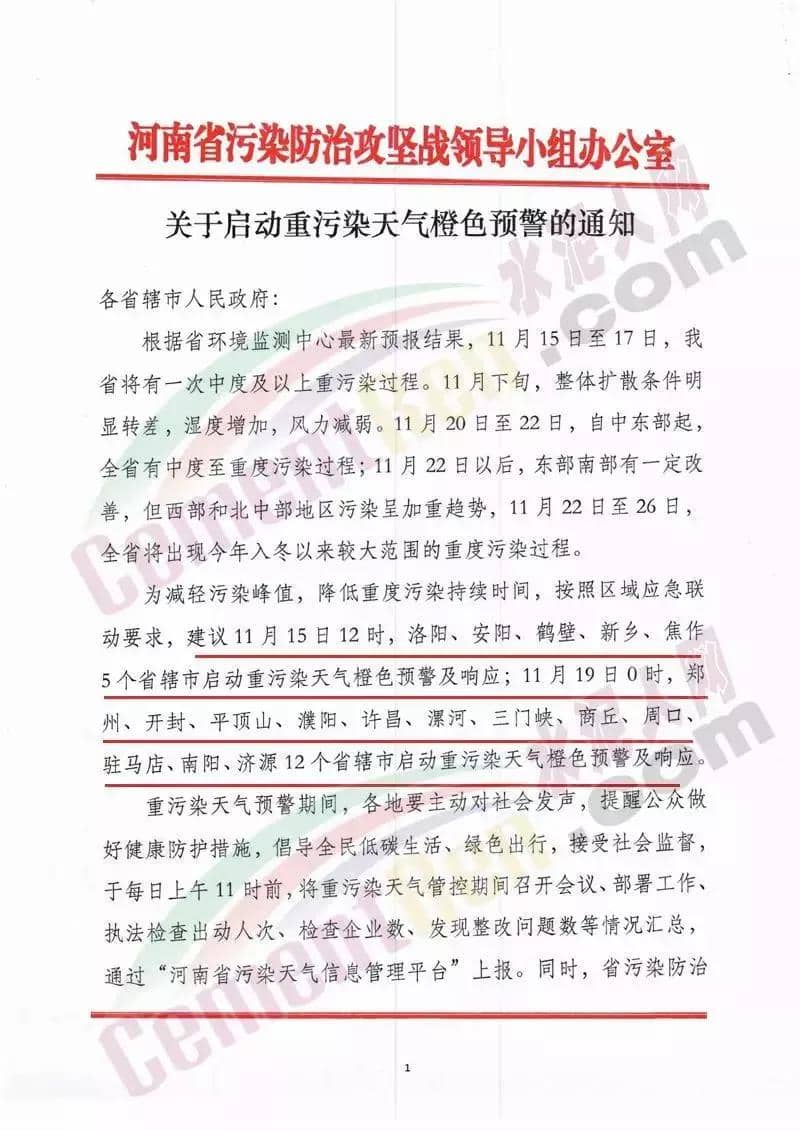 河南南省污染防治攻坚战领导小组办公室建议今日11月15日12时,洛阳、安阳、鹤壁、新乡、焦作5个省辖市启动重污染天气橙色预警及响应;11月19日0时,郑州、开封、平顶山、濮阳、许昌、漯河、三门峡、商丘、周口、驻马店、南阳、济源12个省辖市启动重污染天气橙色预警及II响应。