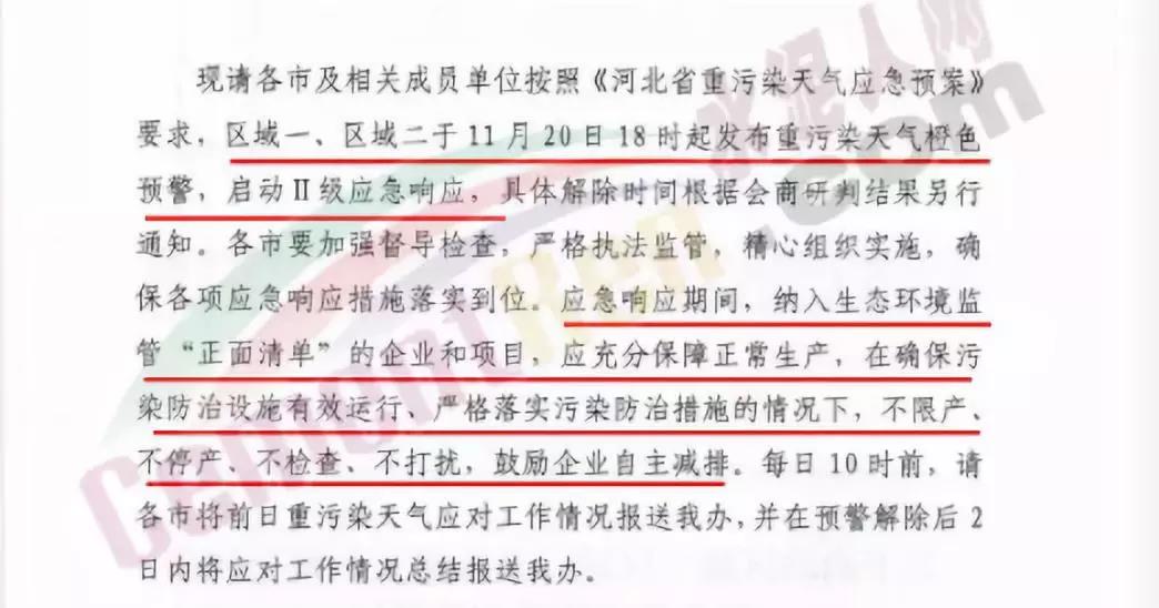 河北省大气污染防治工作领导小组办公室通知文件称要求区域一(石家庄、保定、衡水、邢台、邯郸、定州、辛集、雄安新区)、区域二(唐山、廊坊、沧州、秦皇岛)将于11月20日18时起发布重污染天气橙色预警,启动II级应急响应。应急响应期间,纳入生态环境监管“正面清单”的企业和项目,应充分保障正常生产,在确保污染防治设施有效运行、严格落实污染防治措施的情况下,不限产、不停产、不检查、不打扰,鼓励企业自主减排。
